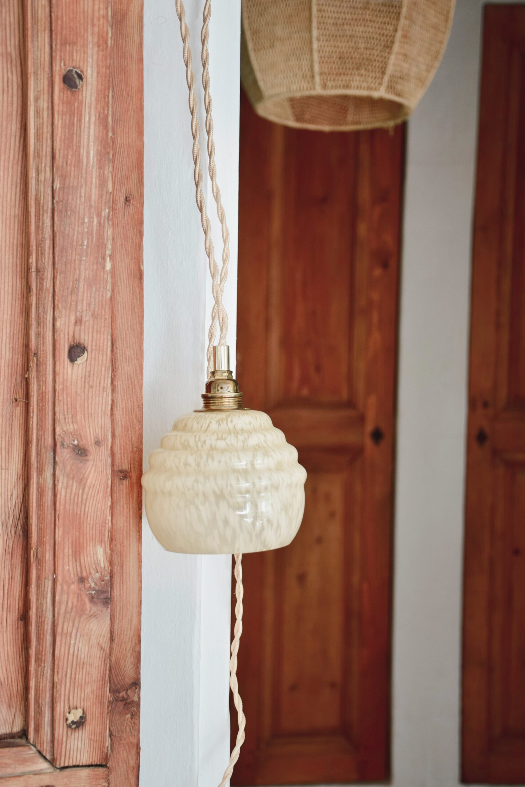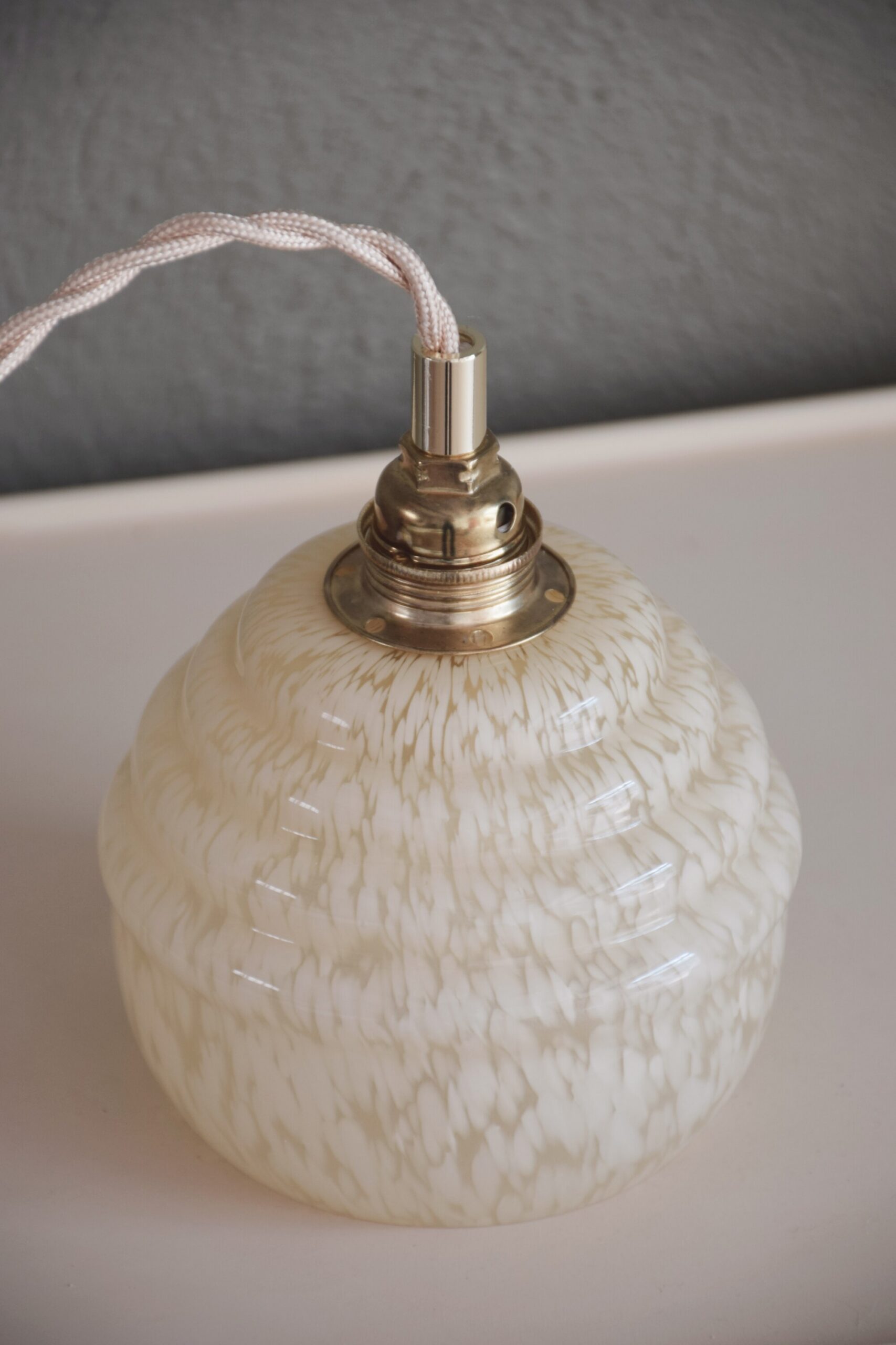 Un joli model d’opaline mouchetée, enrobée de ce verre translucide qui dégage une somptueuse lumière. Une version nacrée, avec une douce couleur pêche et un fil torsadé doré. L’opaline est d’origine et le montage électrique flambant neuf avec d’élégantes finitions laiton et un interrupteur épuré, pour passer du jour à la nuit en tout confort.
