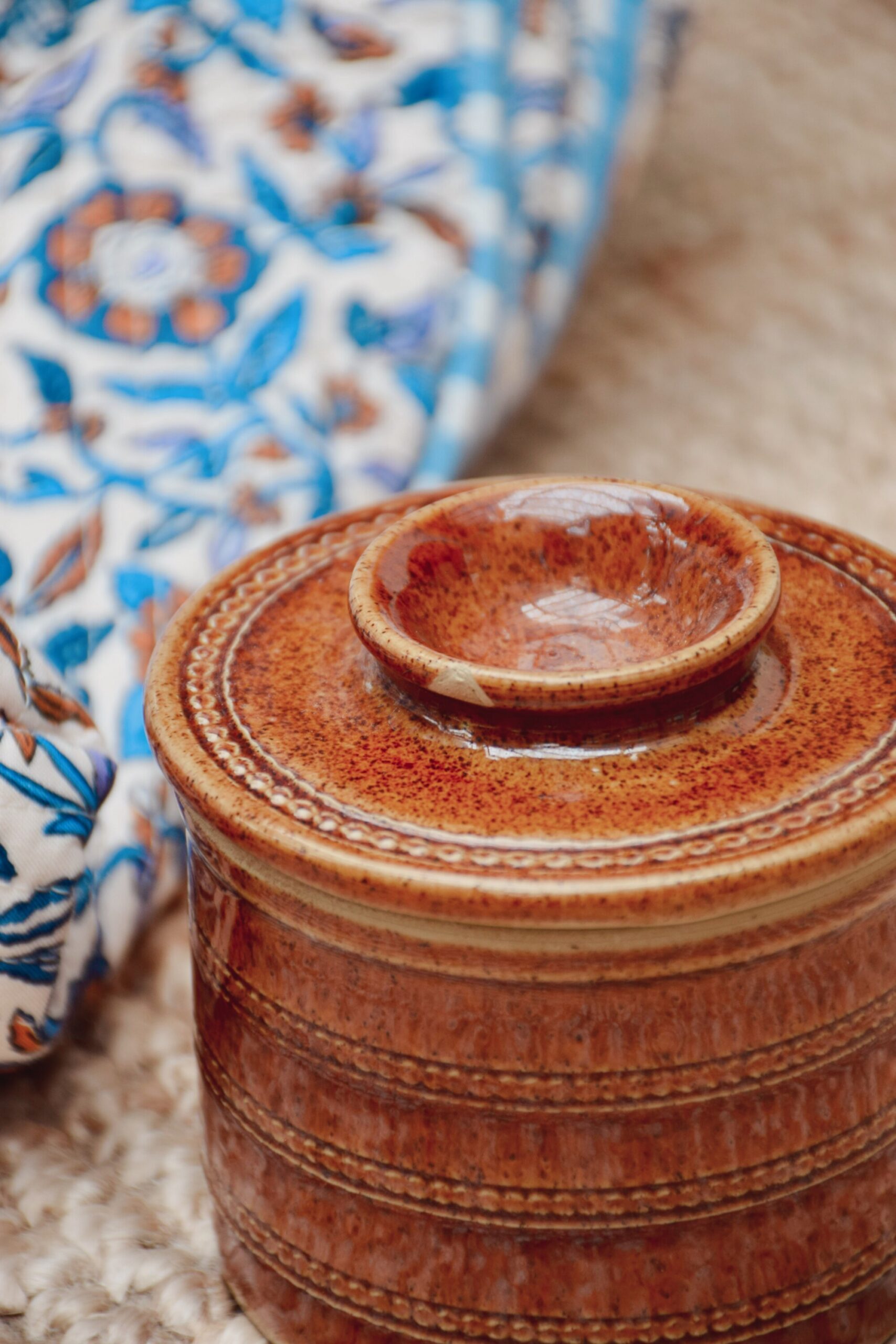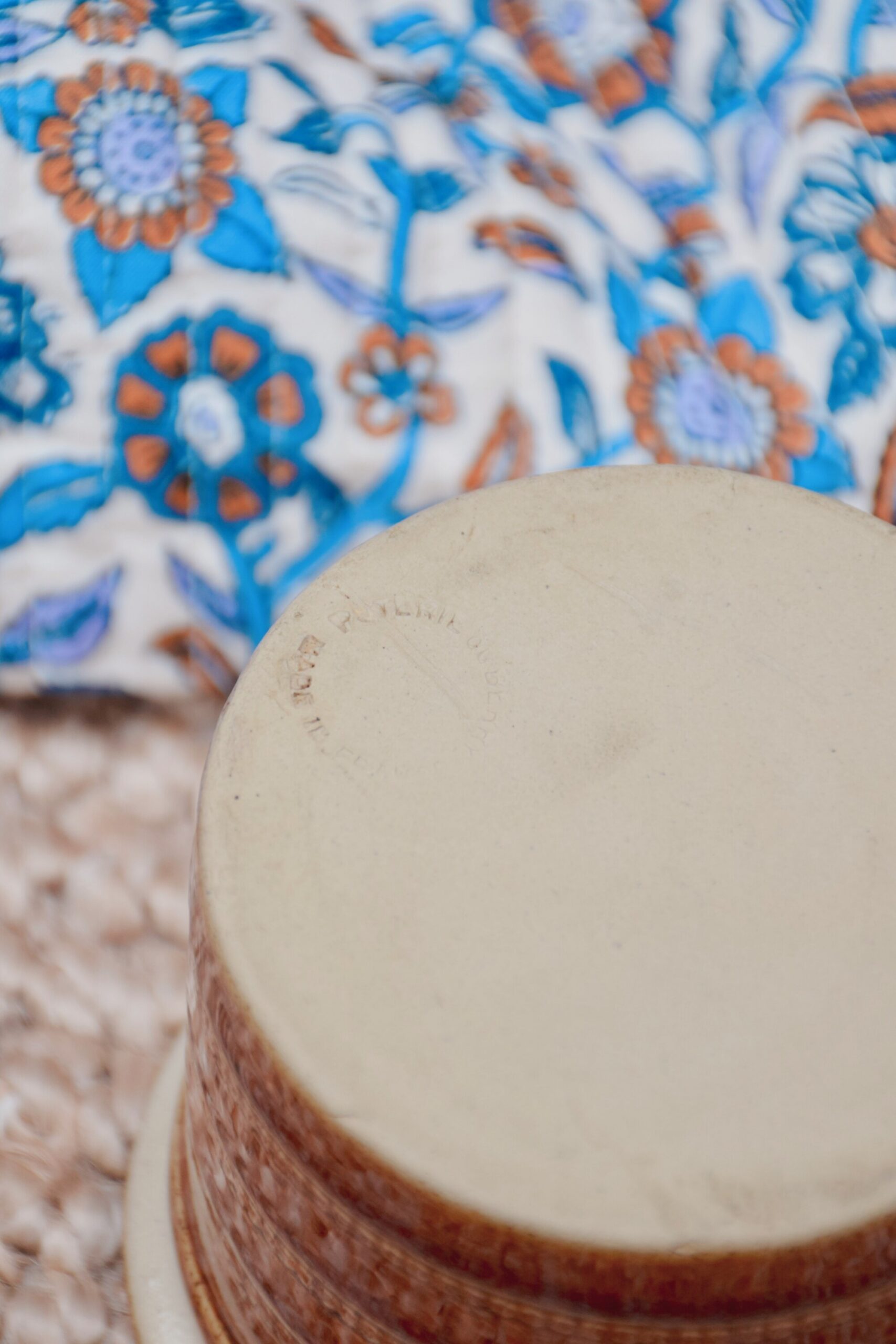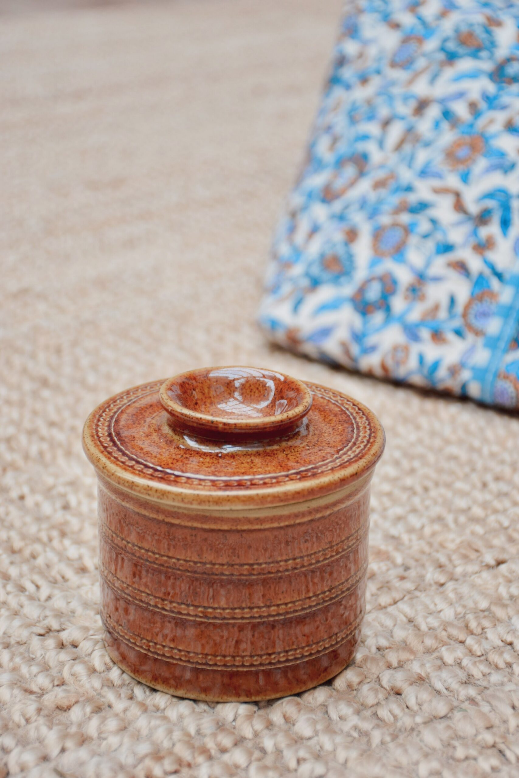 Il s’agit d’une pièce incontournable pour les gourmands : Un Joli beurrier à eau en grès vernissé, fabriqué en France par la Poterie du Berry 🇫🇷.