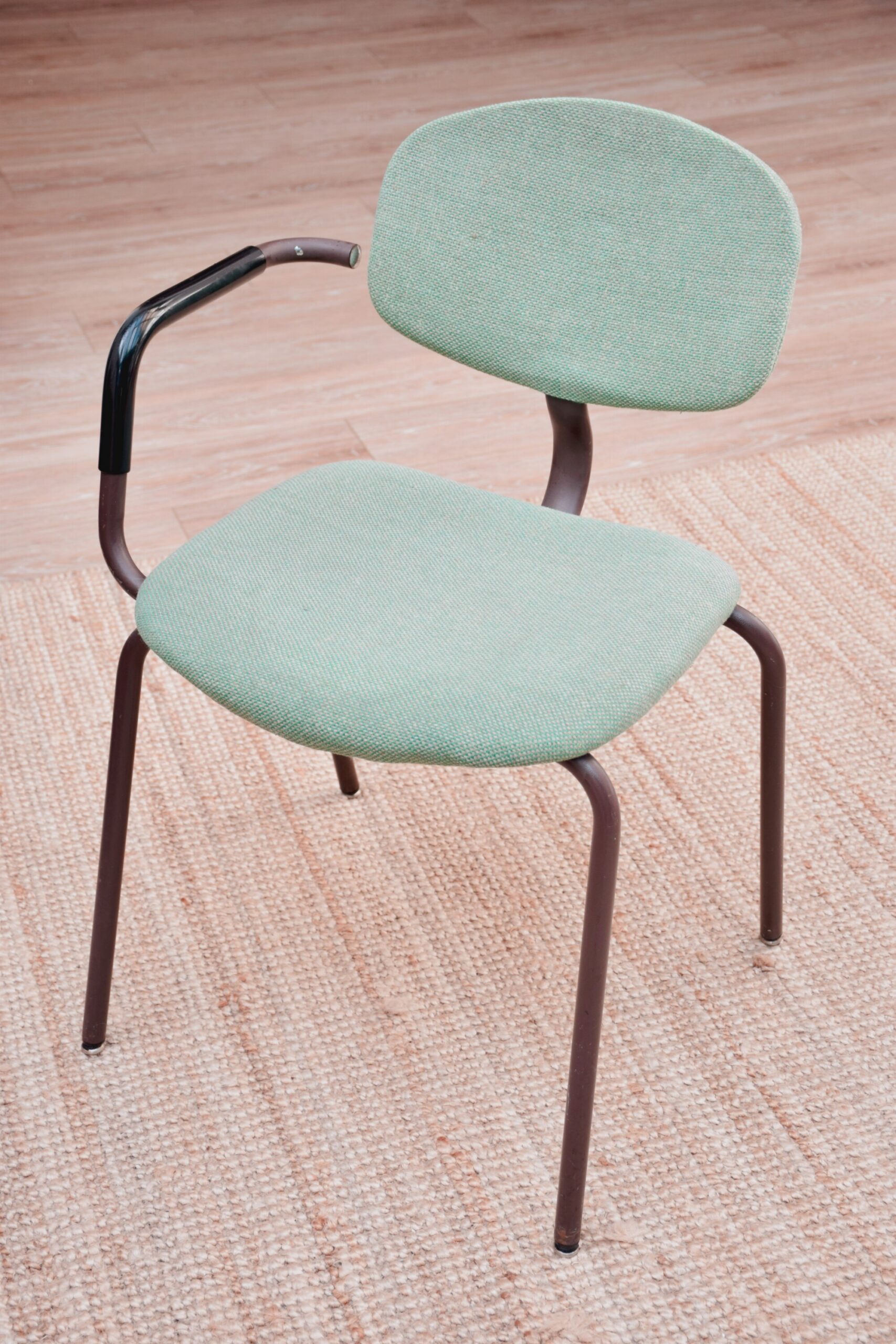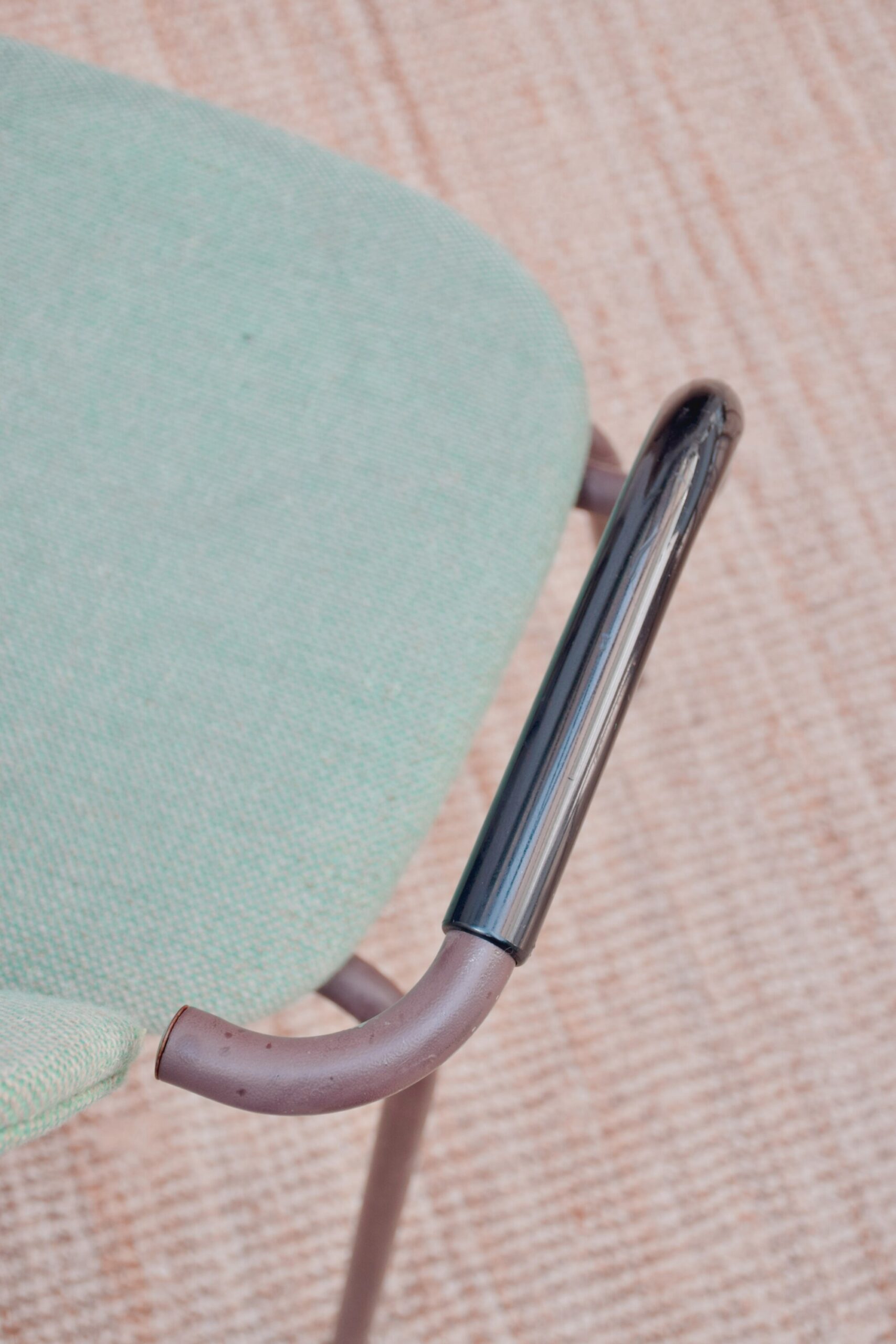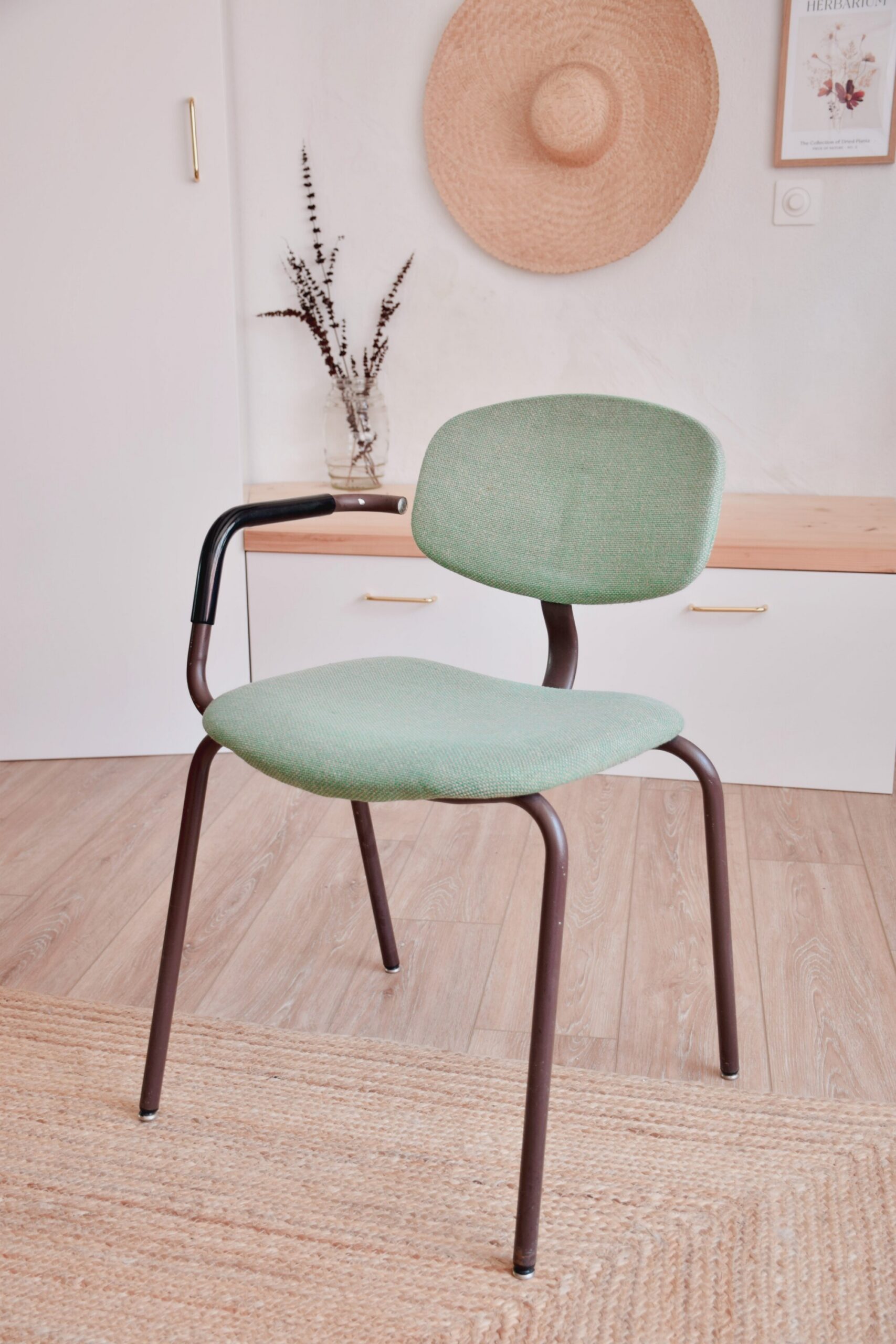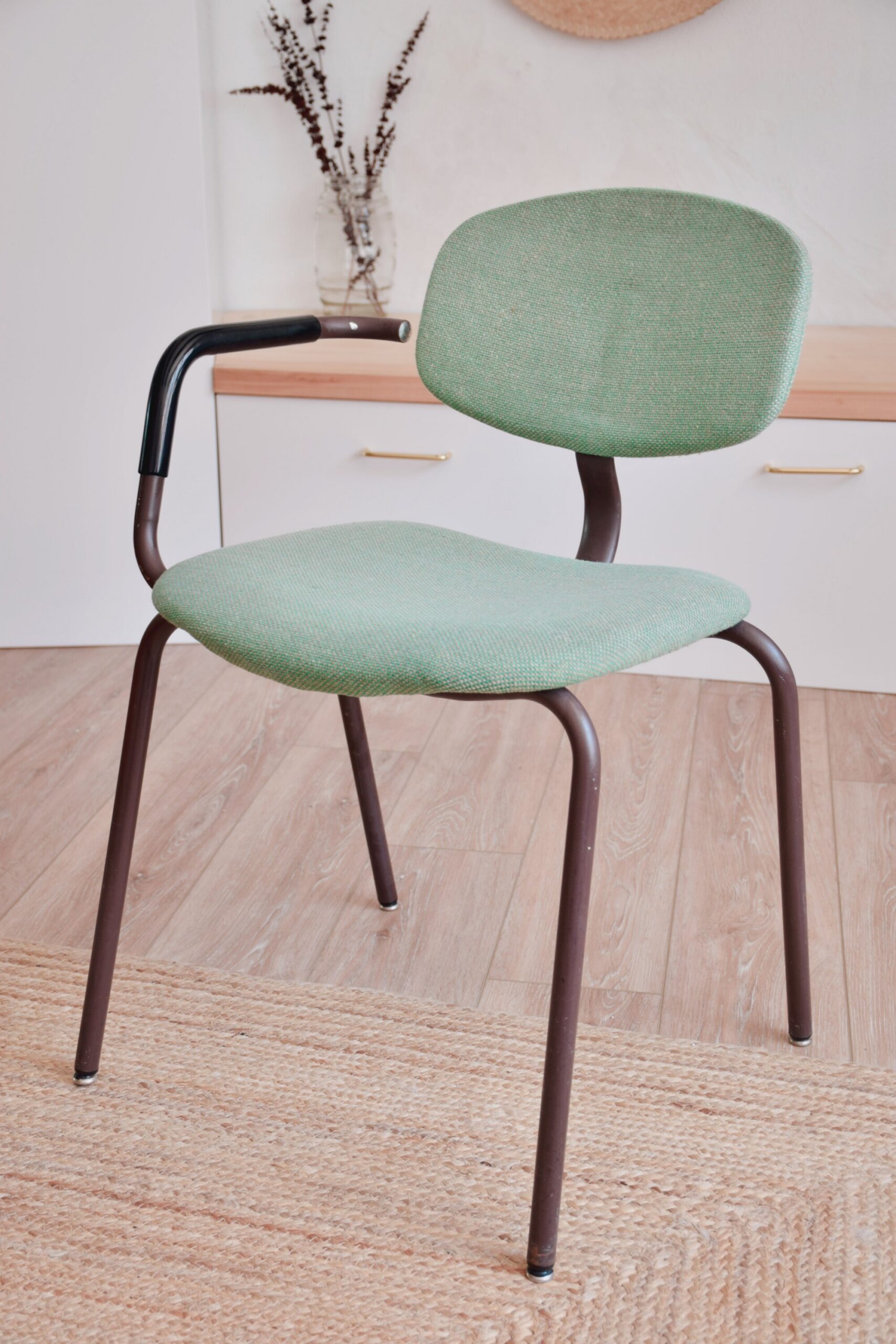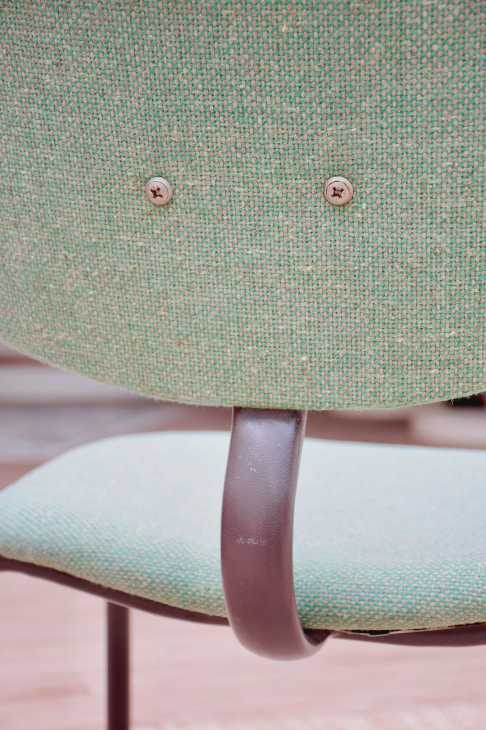 Ce fauteuil au design arrondi et épuré date des années 70. Avec sa structure tubulaire son assise en coque, son tissu chiné dans un magnifique vert d’eau et son accoudoir unique, il est la pièce maîtresse de design dans votre espace télétravail.