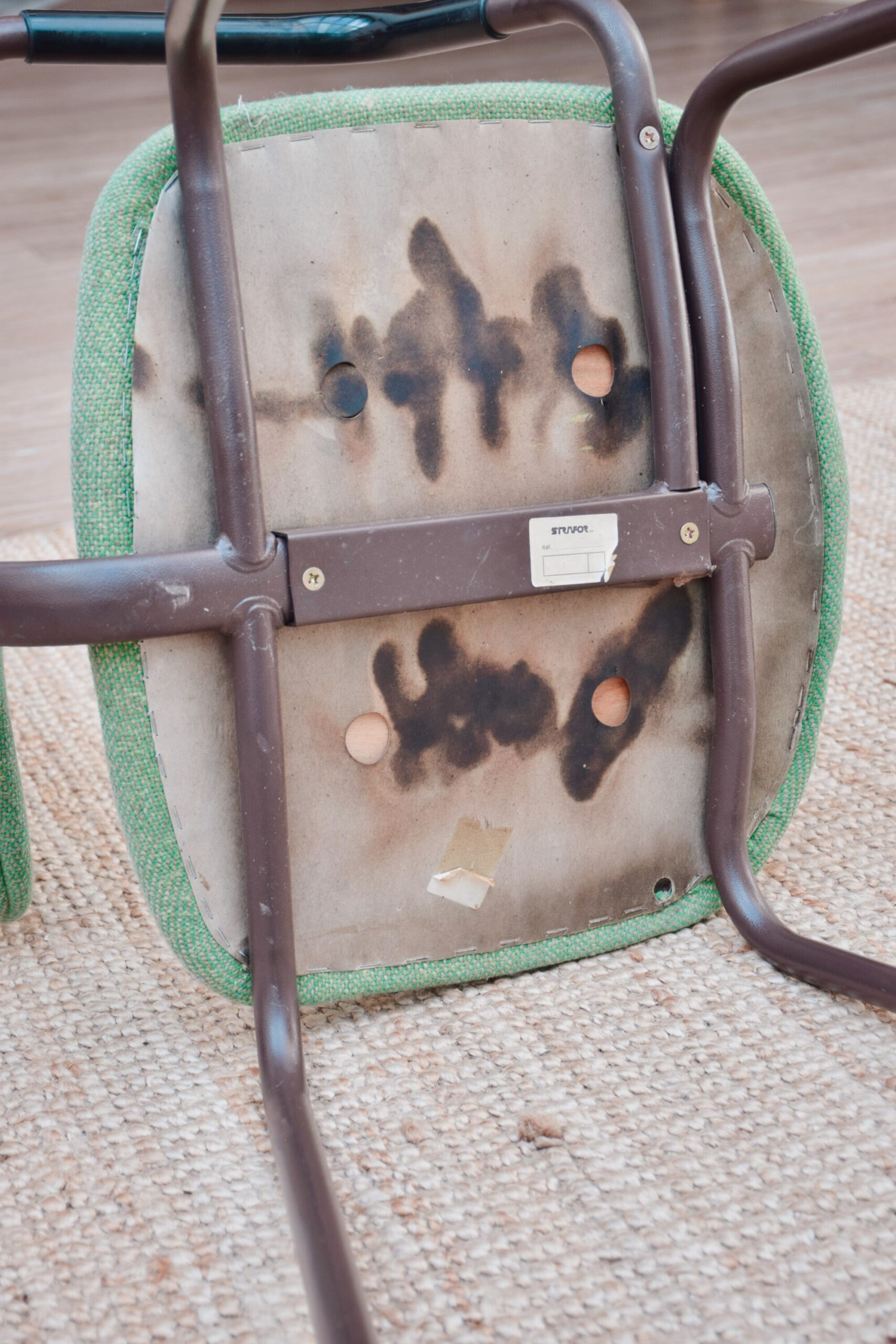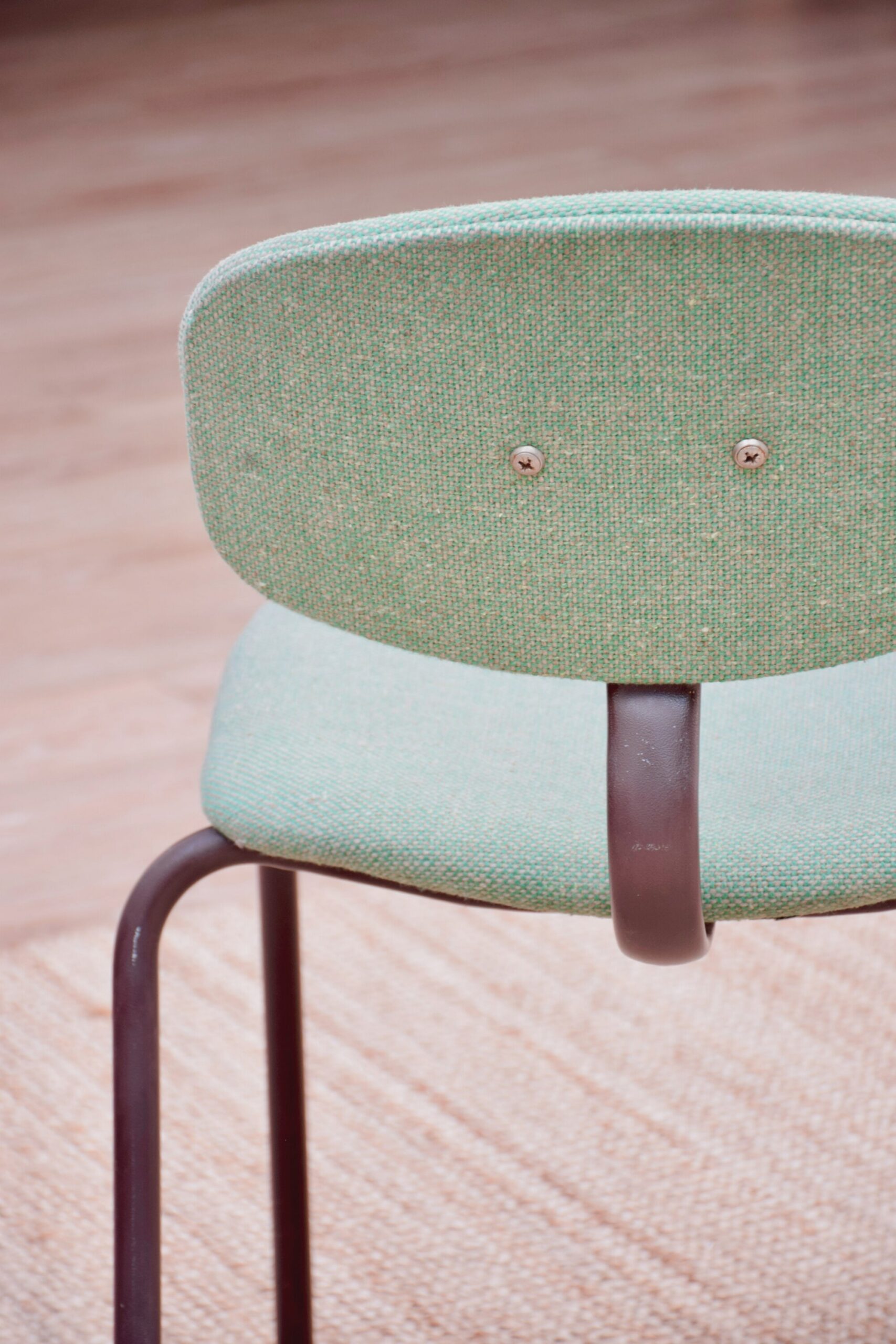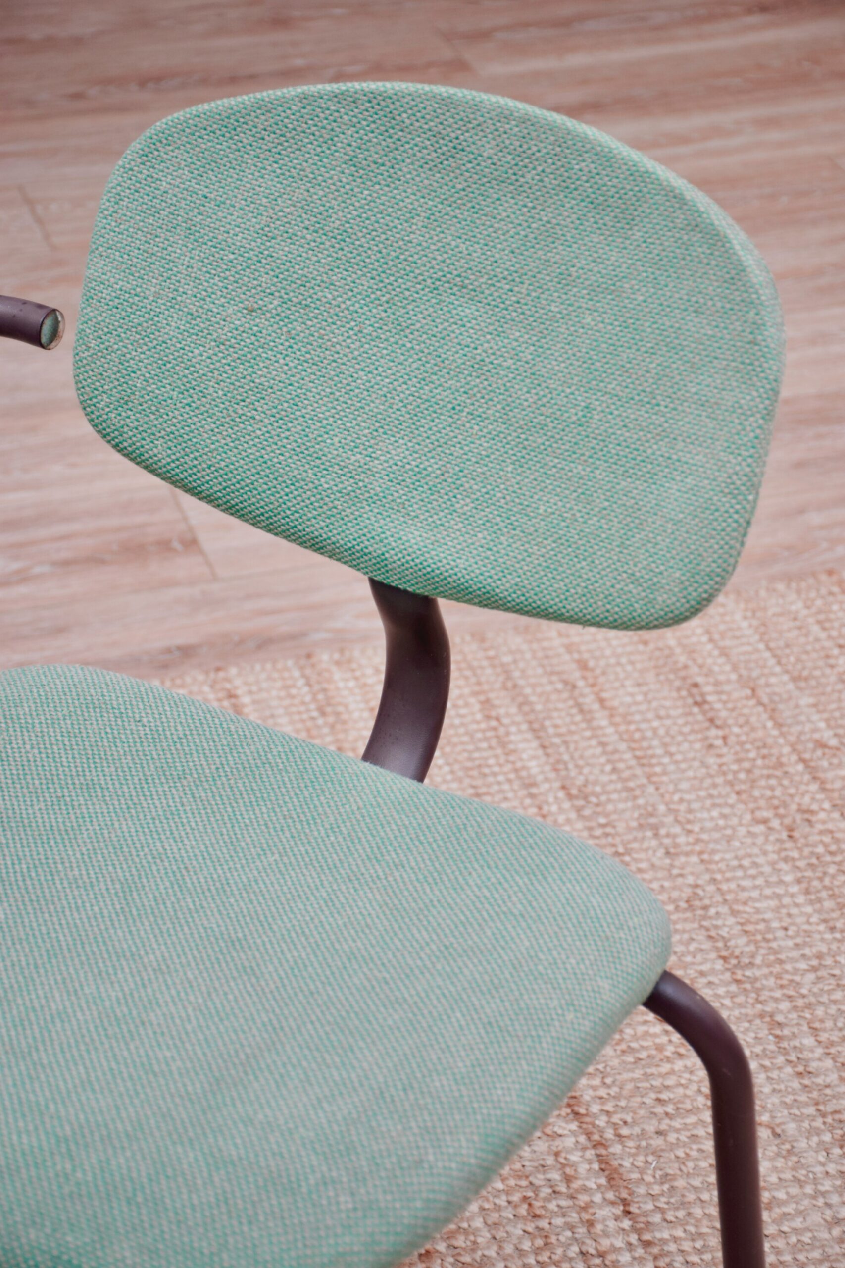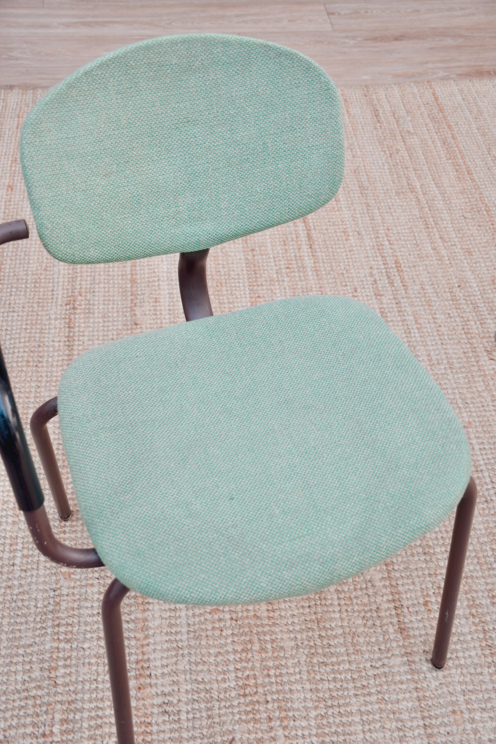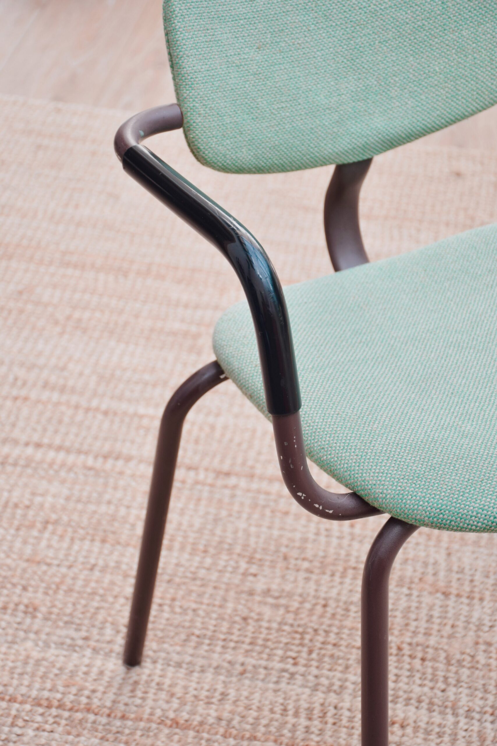 Ce fauteuil au design arrondi et épuré date des années 70. Avec sa structure tubulaire son assise en coque, son tissu chiné dans un magnifique vert d’eau et son accoudoir unique, il est la pièce maîtresse de design dans votre espace télétravail.