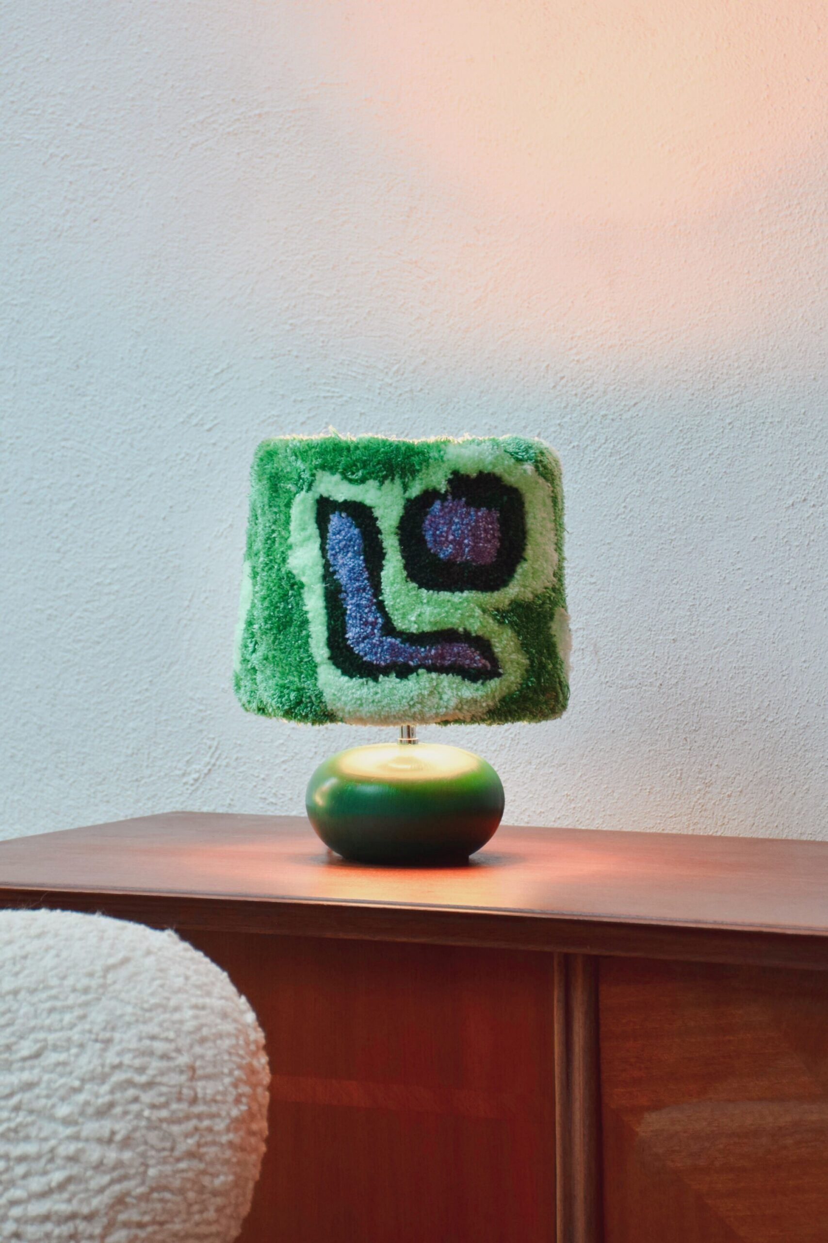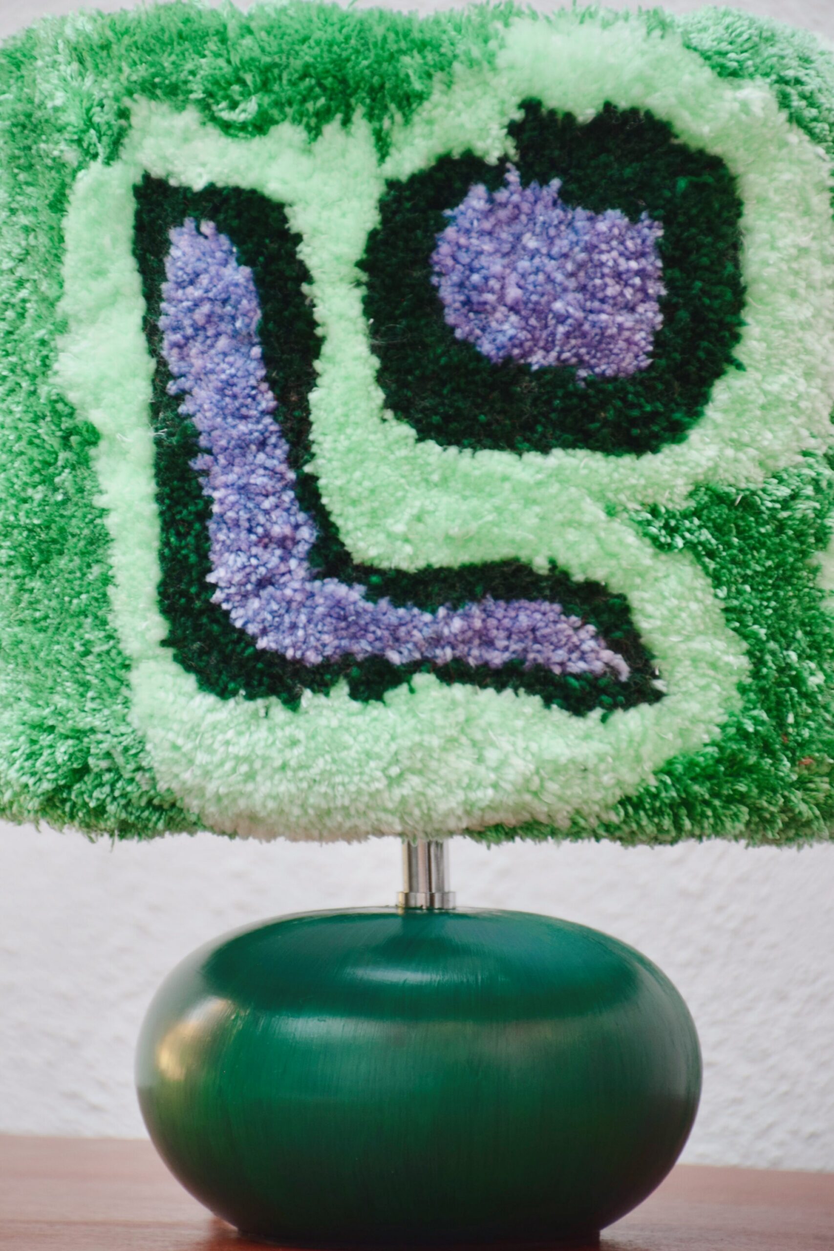 Chinée par Les Archives et relookée par Liso Design, cette lampe associe un élégant pied vert forêt d’une rondeur organique à un abat-jour au tufting tout doux et plein de pep’s réalisé à base de laine 100% 2nde main !
