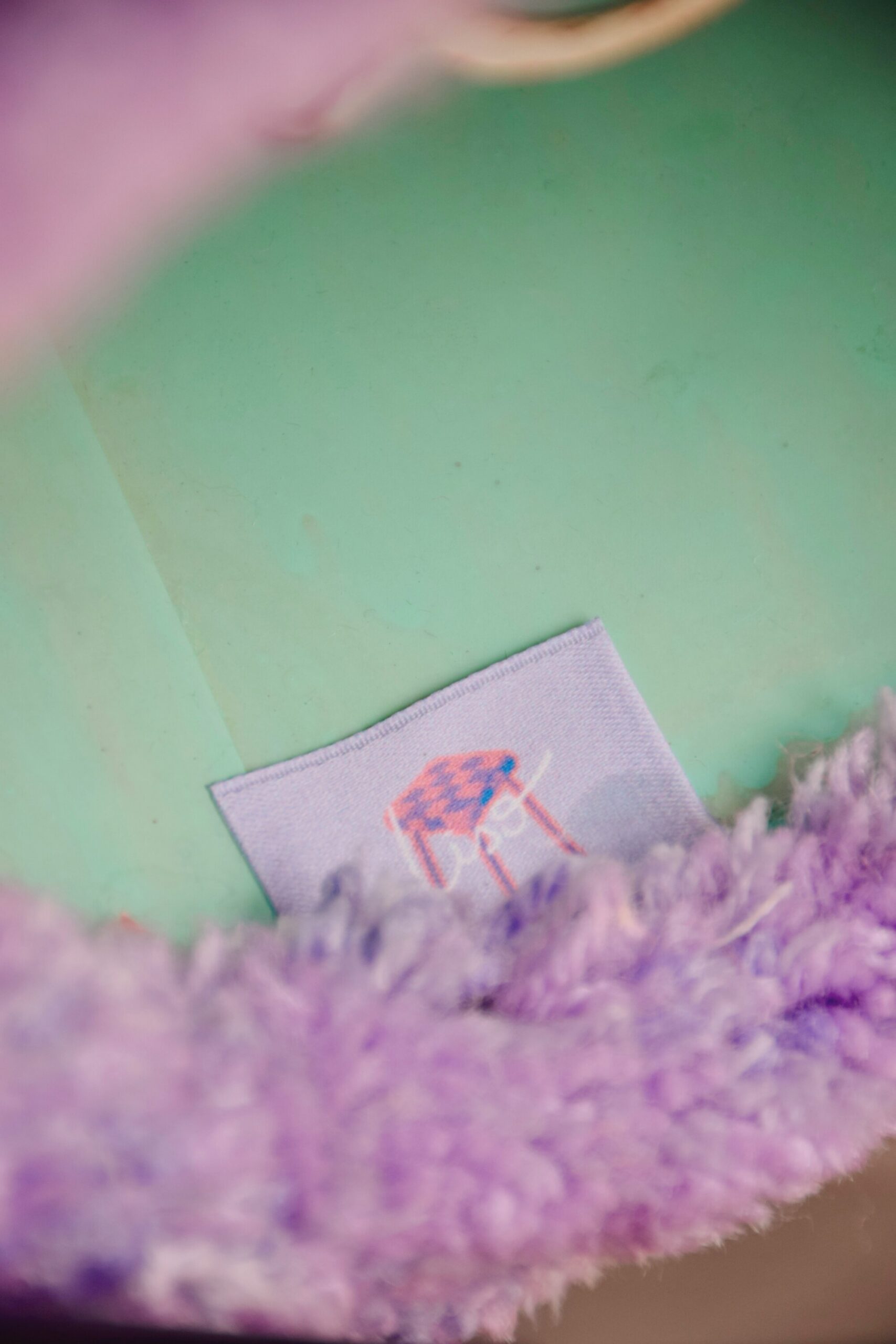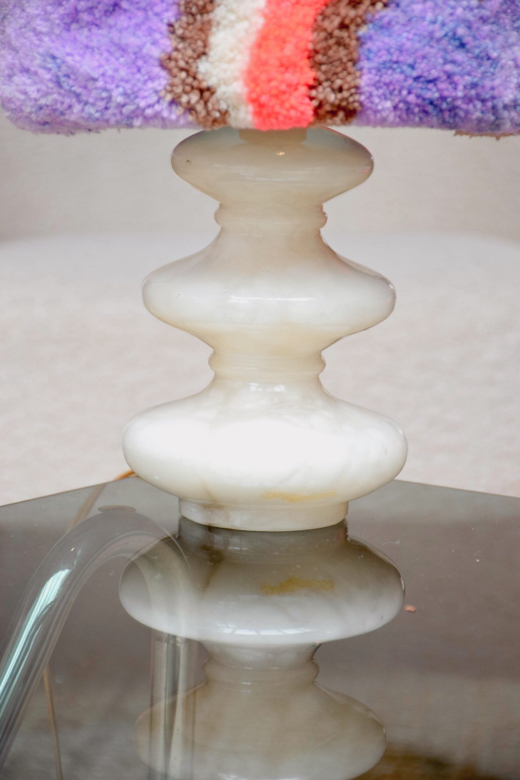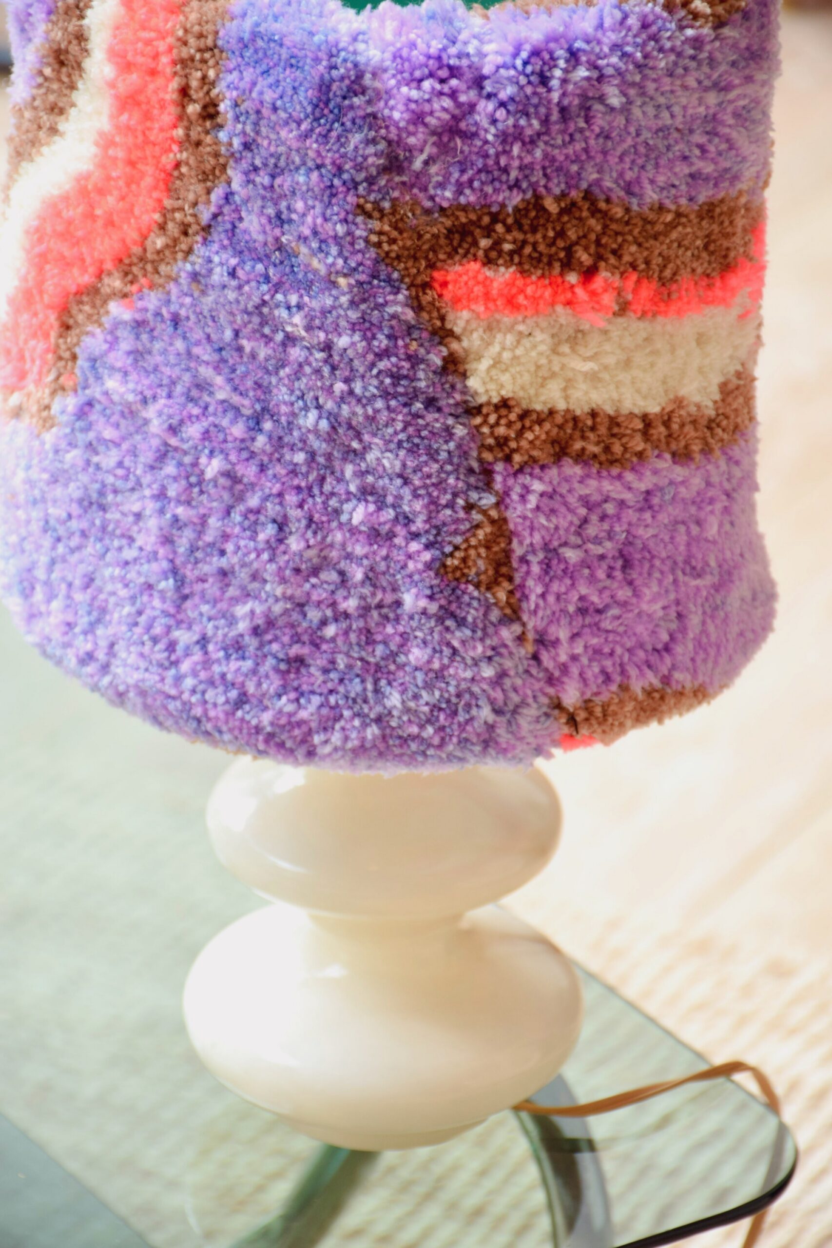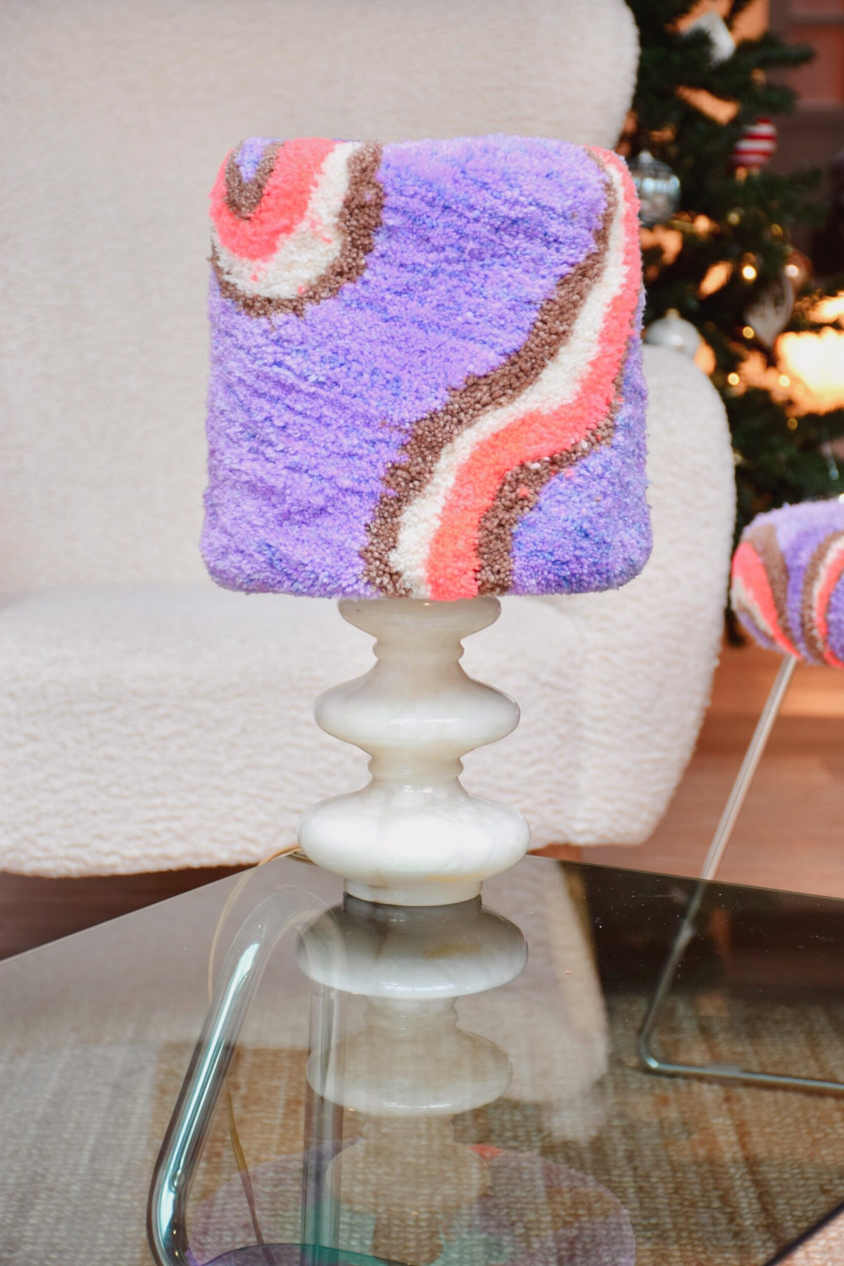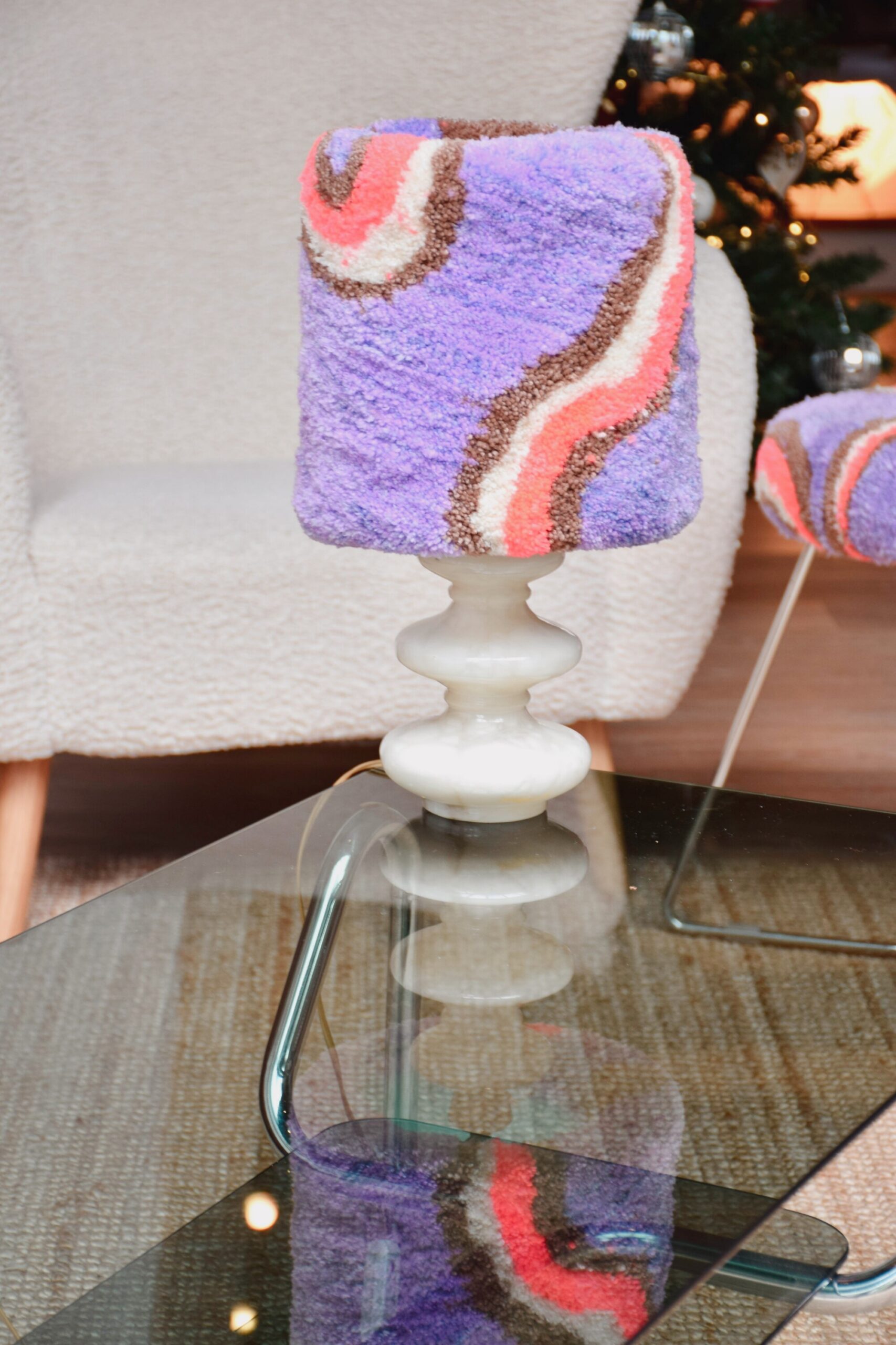 Chinée par Les Archives et relookée par Liso Design, cette lampe associe un élégant pied en albâtre à un abat-jour au tufting purple tout doux et plein de pep’s réalisé à base de laine 100% 2nde main !