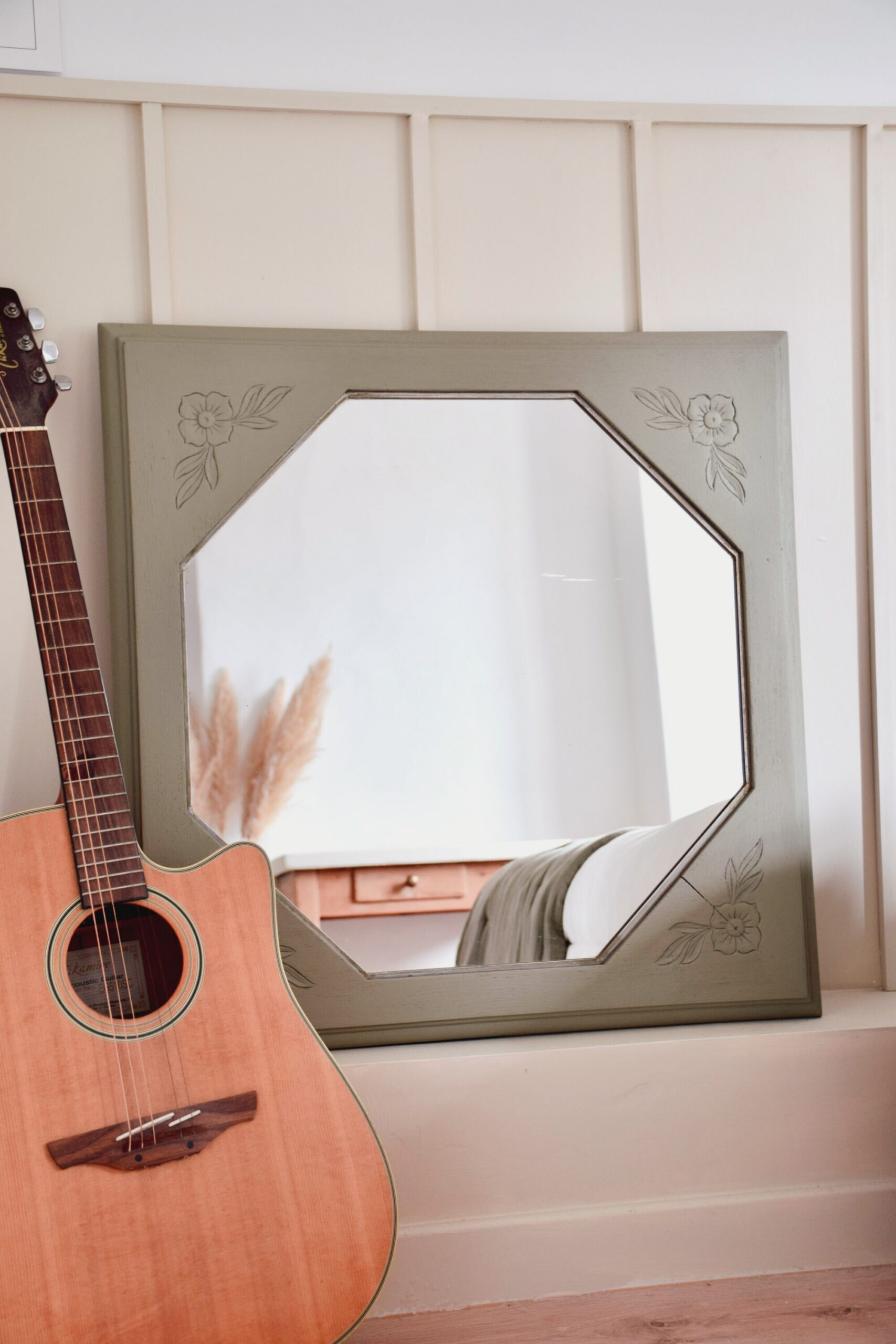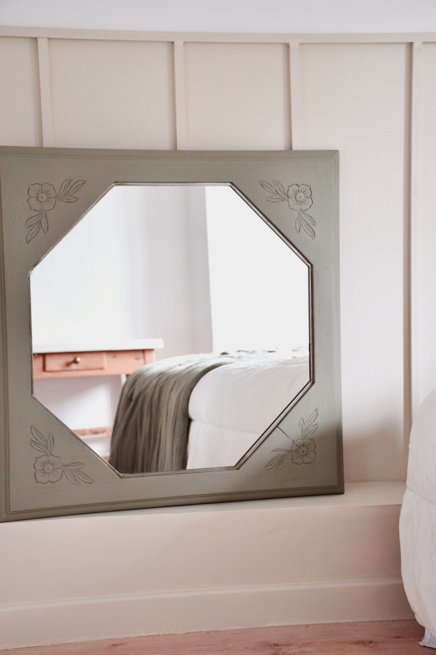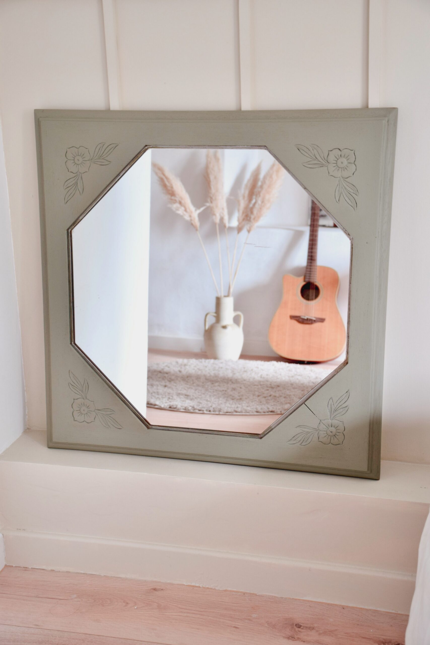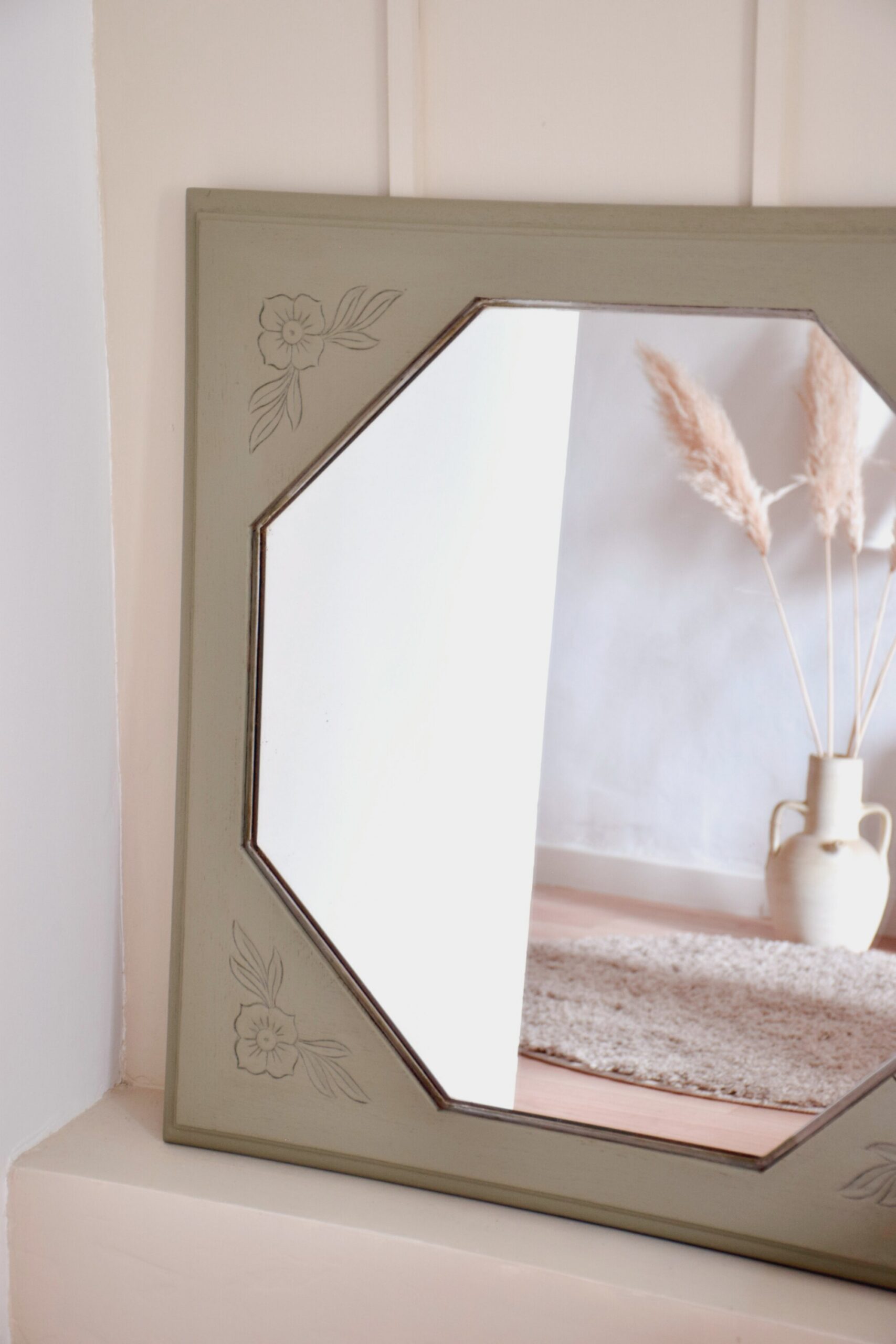 J’aime l’originalité de ce miroir, sa forme octogonale habillée d’un vert olive charmant et chaleureux.