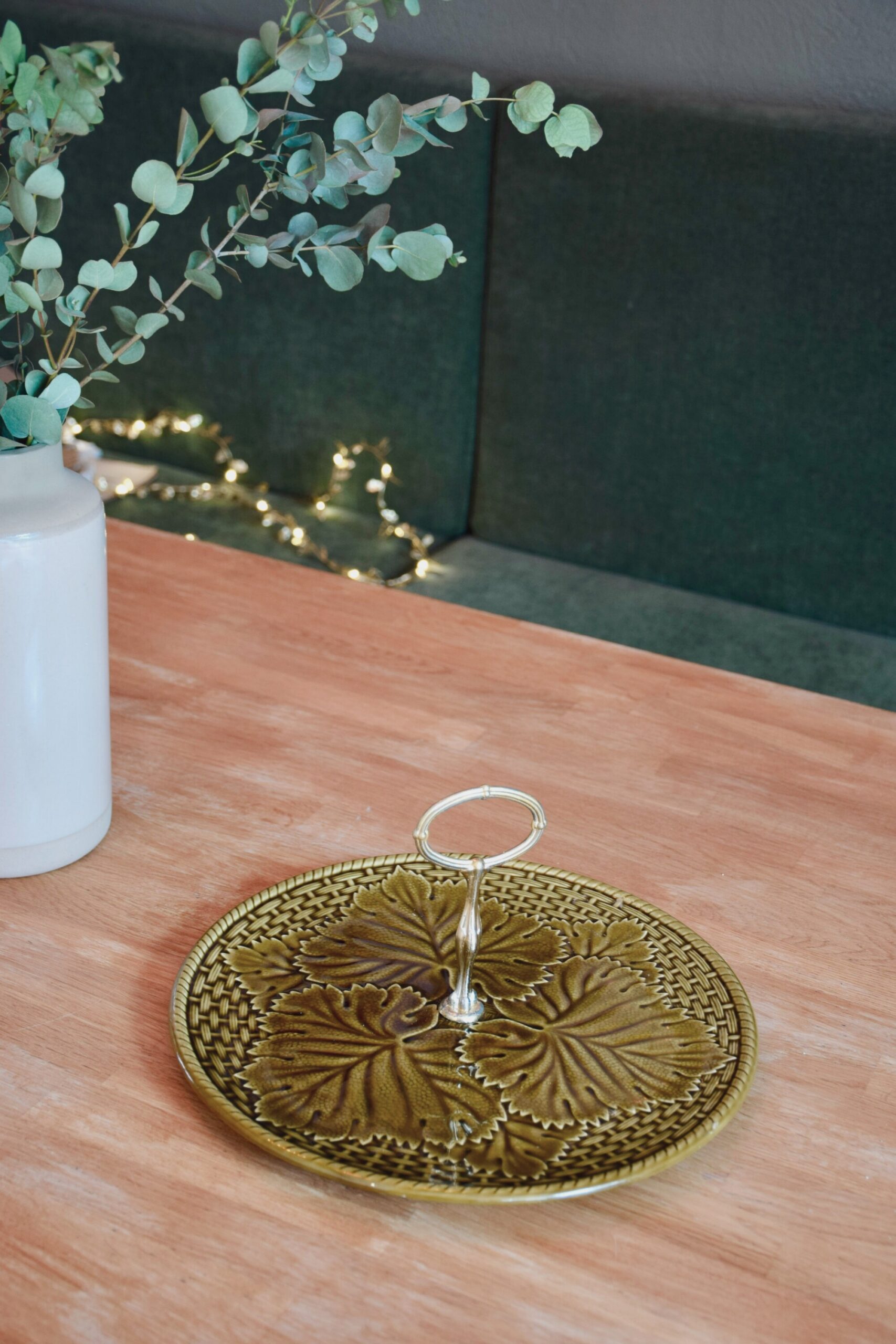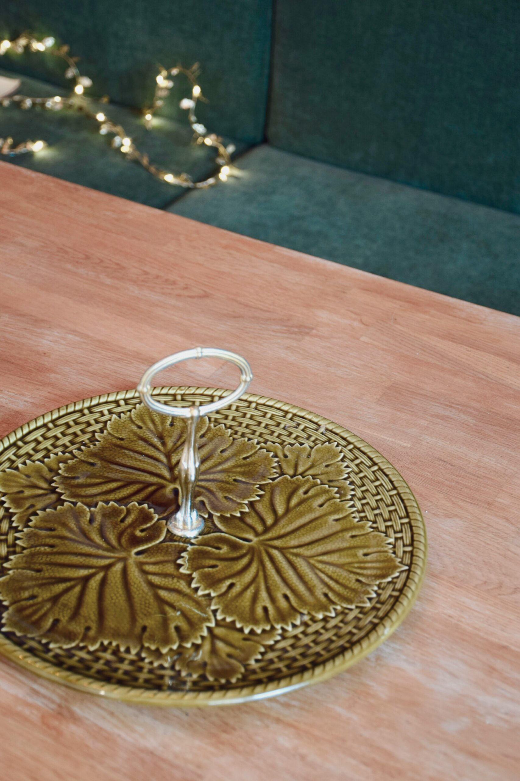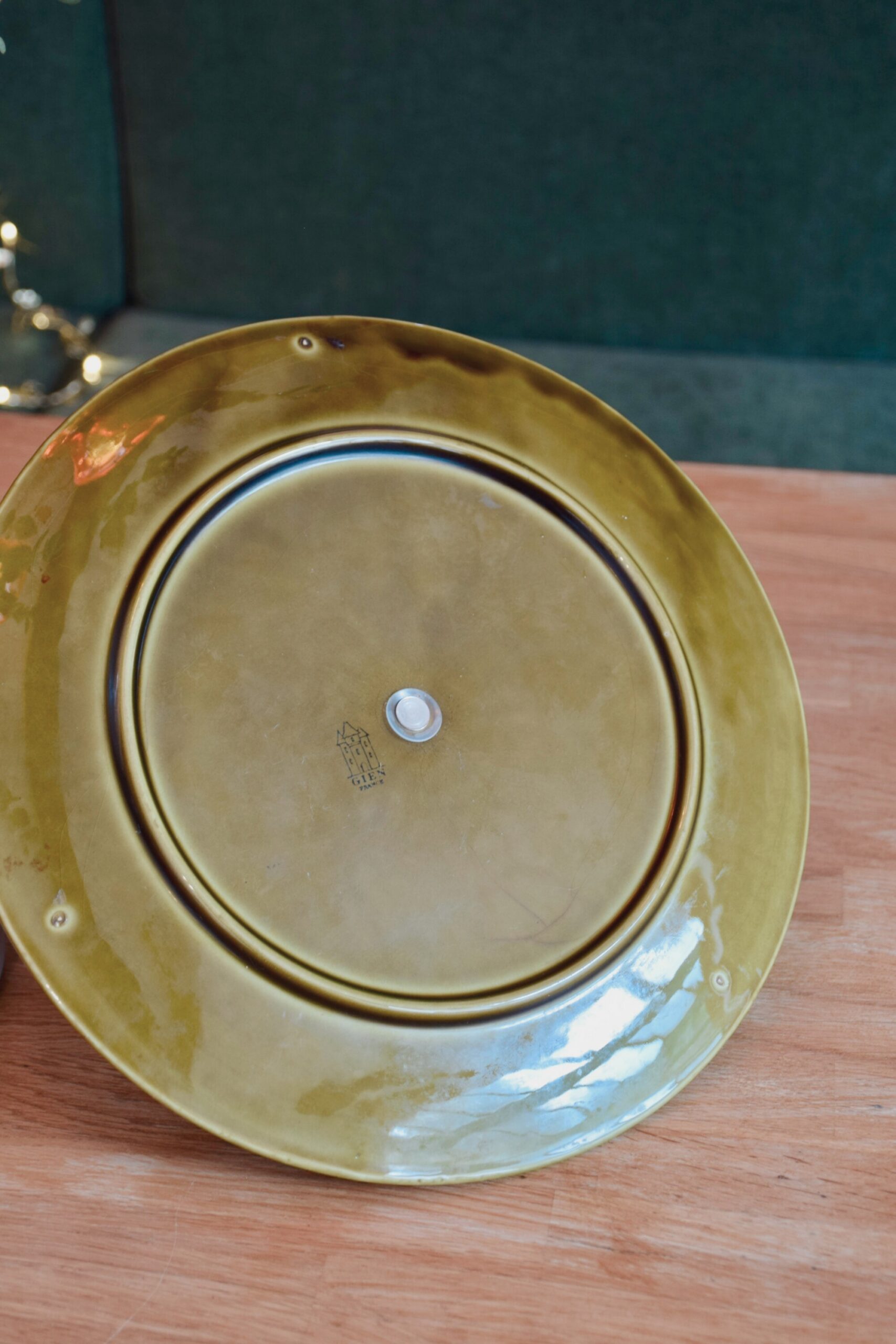 Découvrez ce plateau à fromage des années 60 en faïence de Gien. D’une couleur vert olive, il est décoré par des motifs de tressage de panier et de feuilles de vigne.