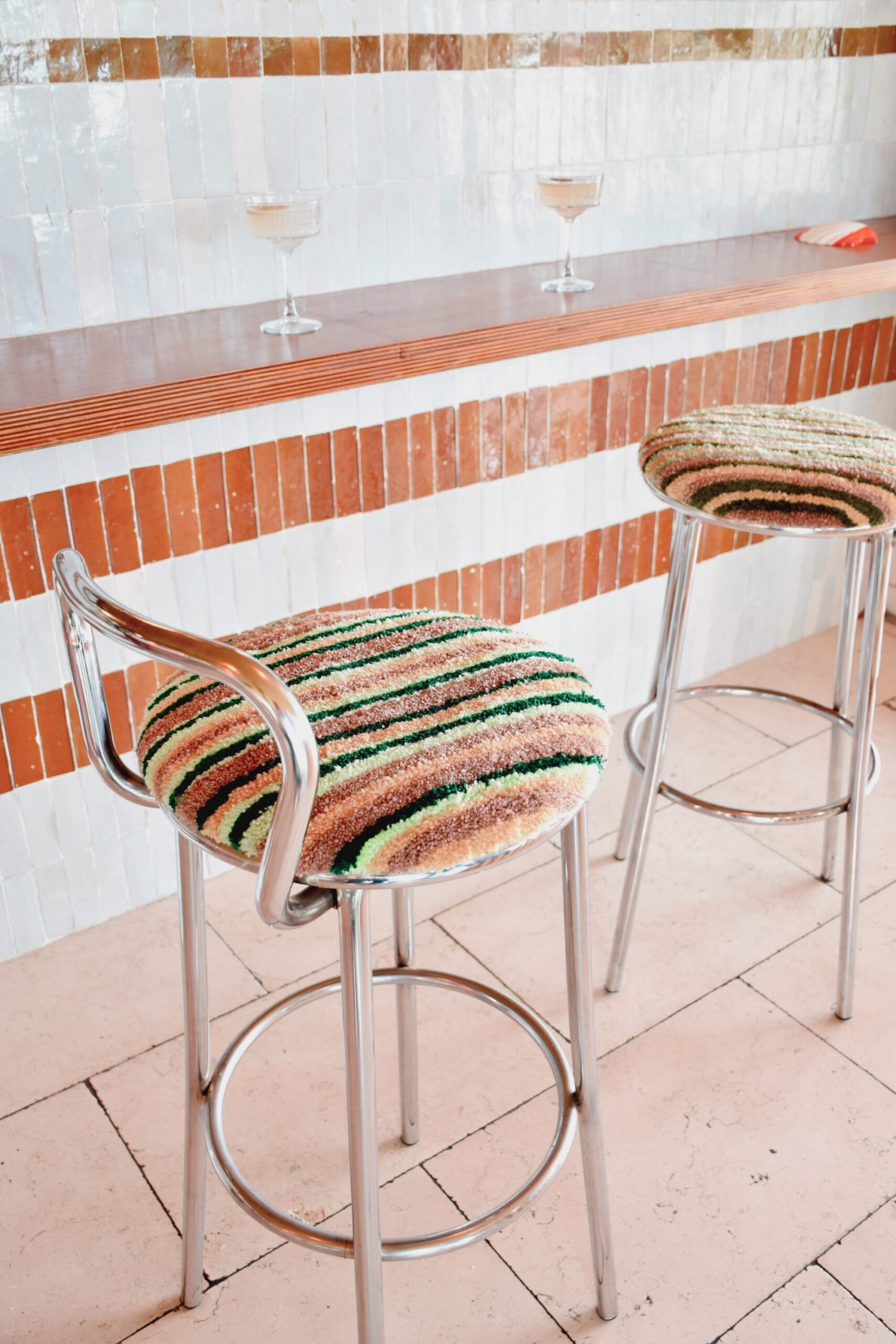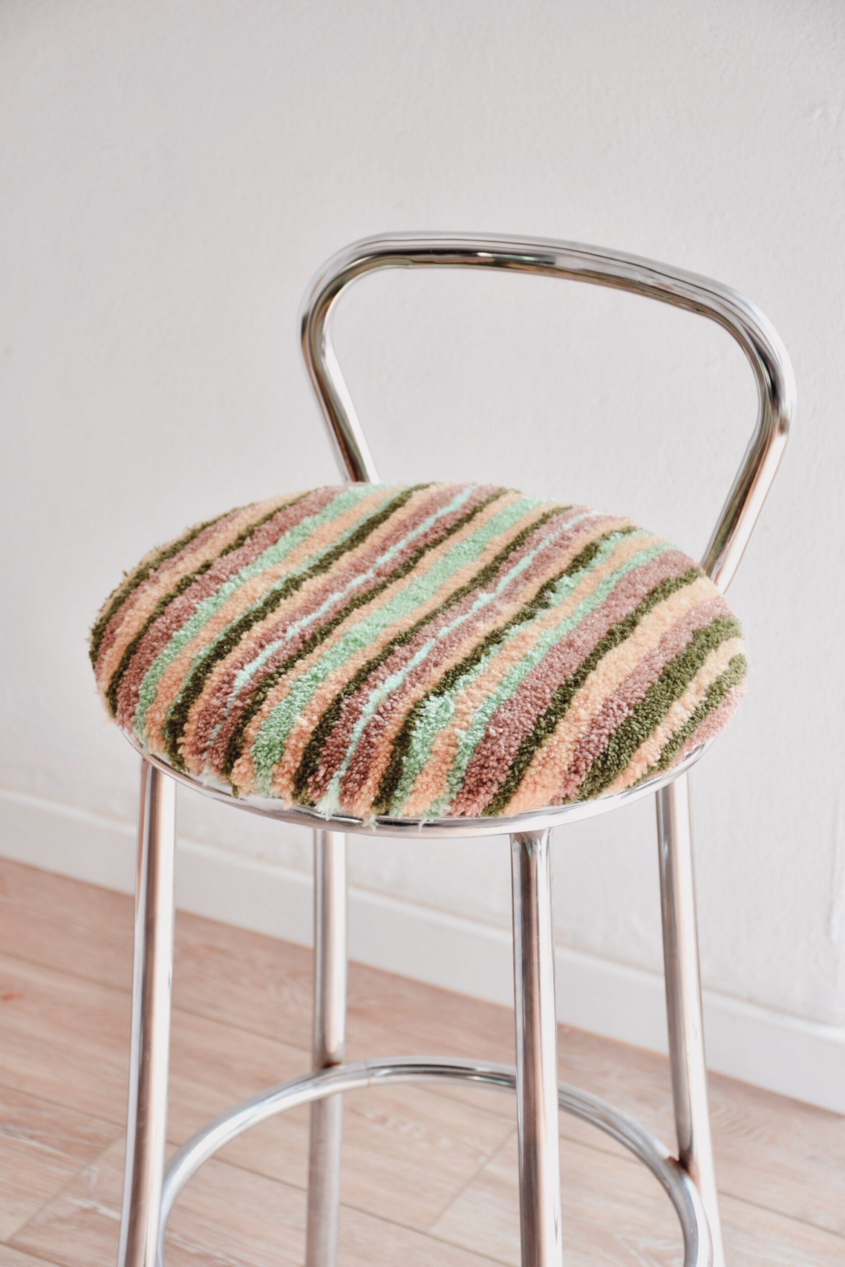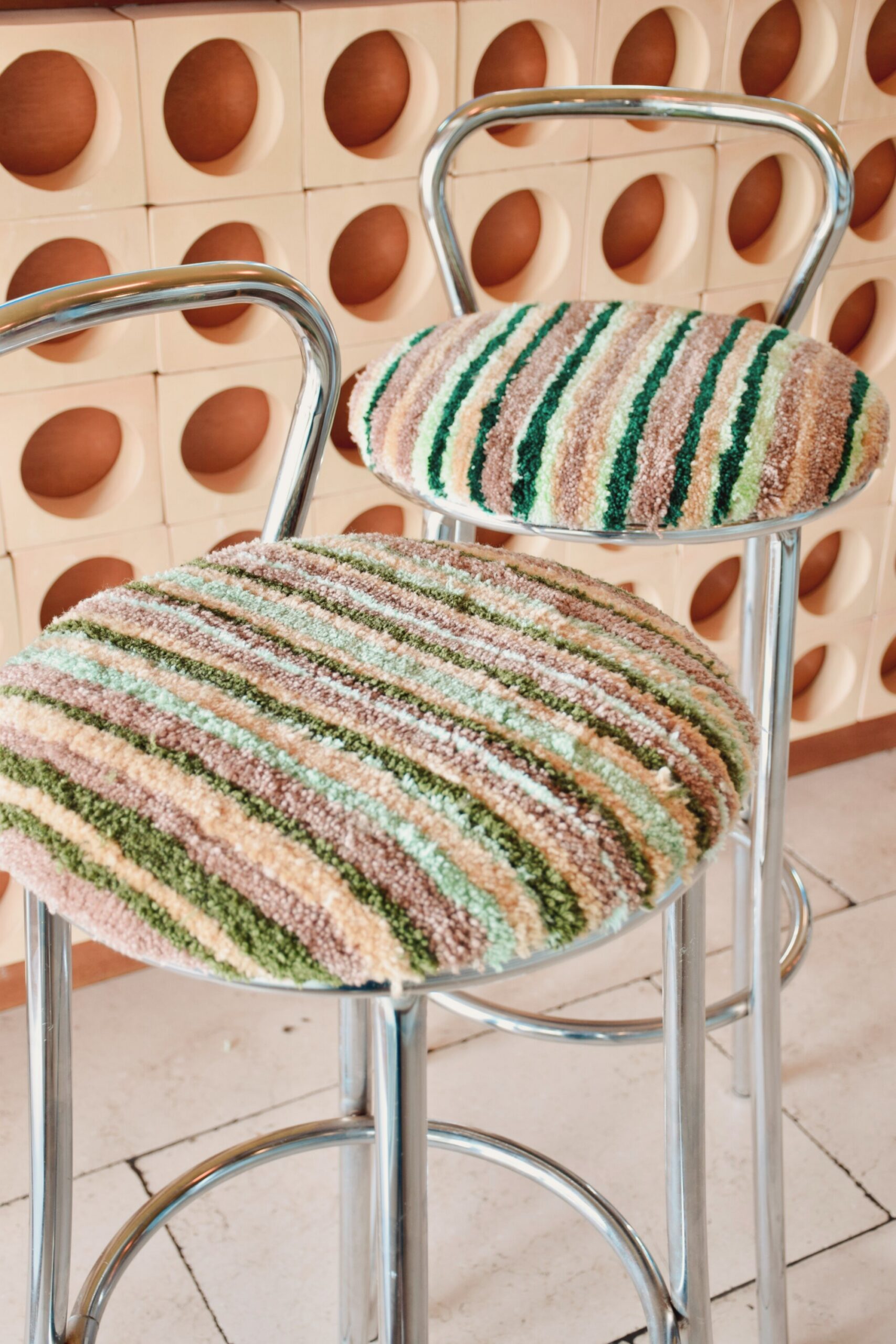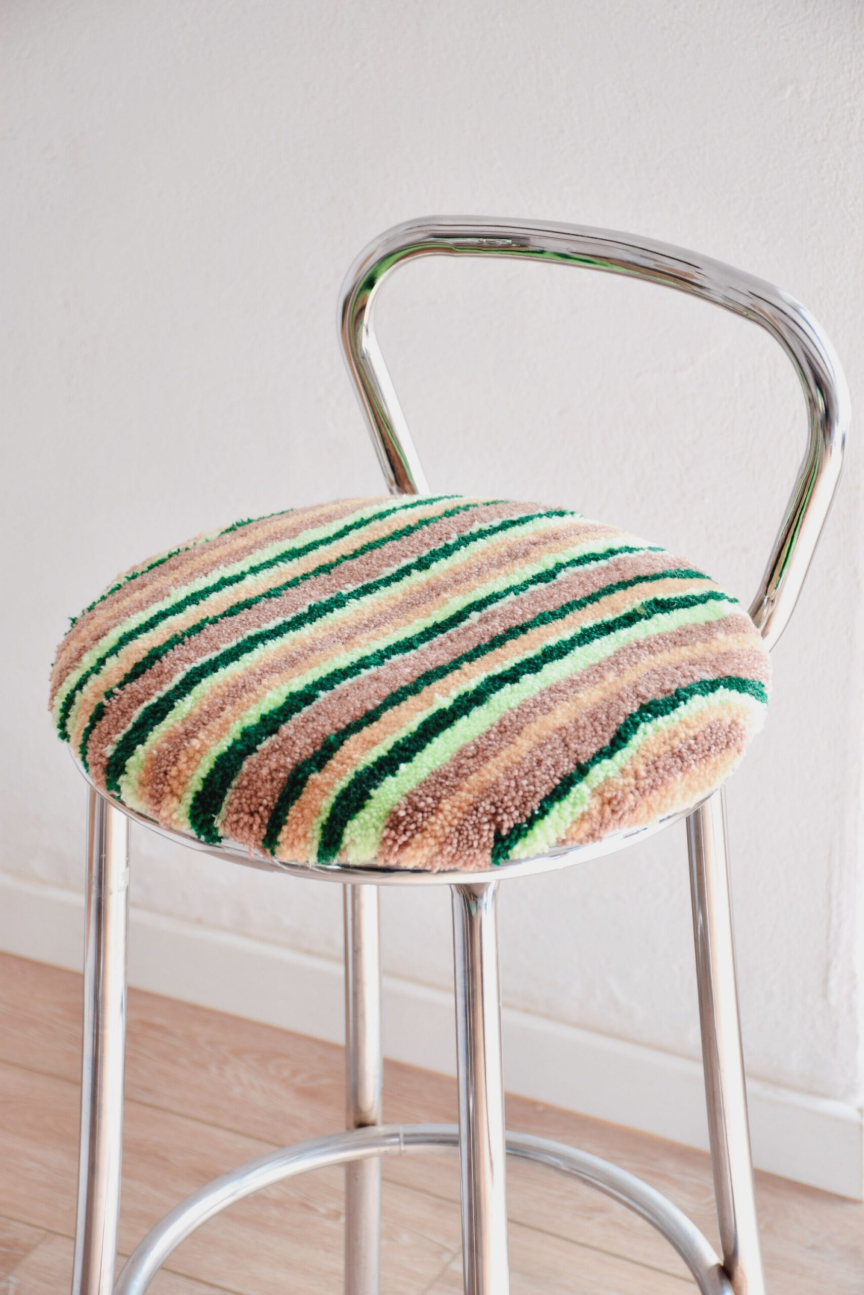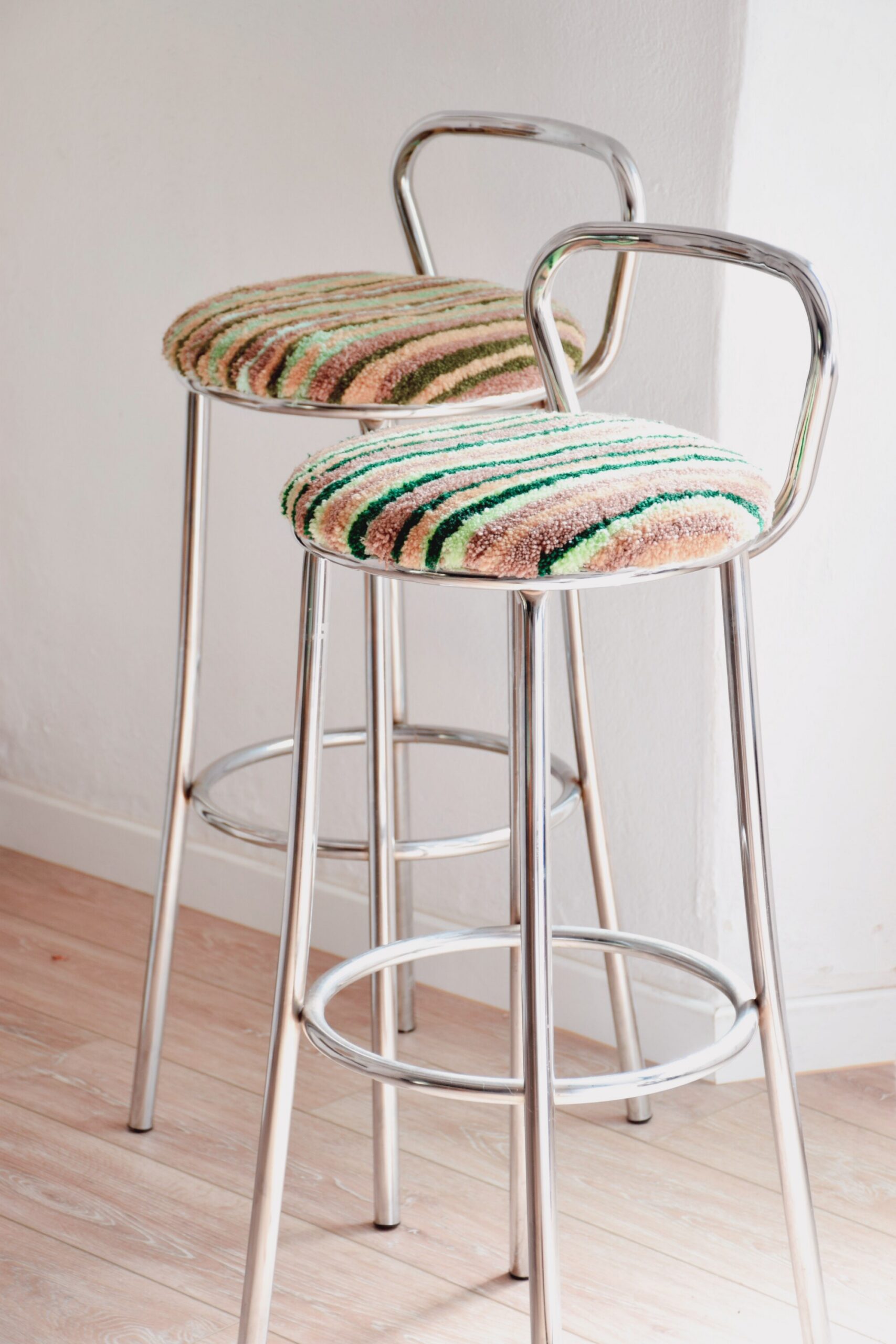 Leur assise en tufting est made by la talentueuse Liso Design avec du tissu et de la laine 100% seconde main qu’elle chine avec soin.