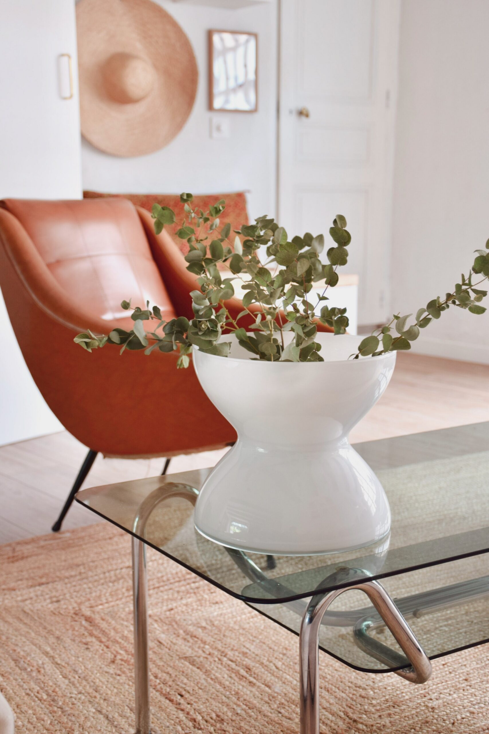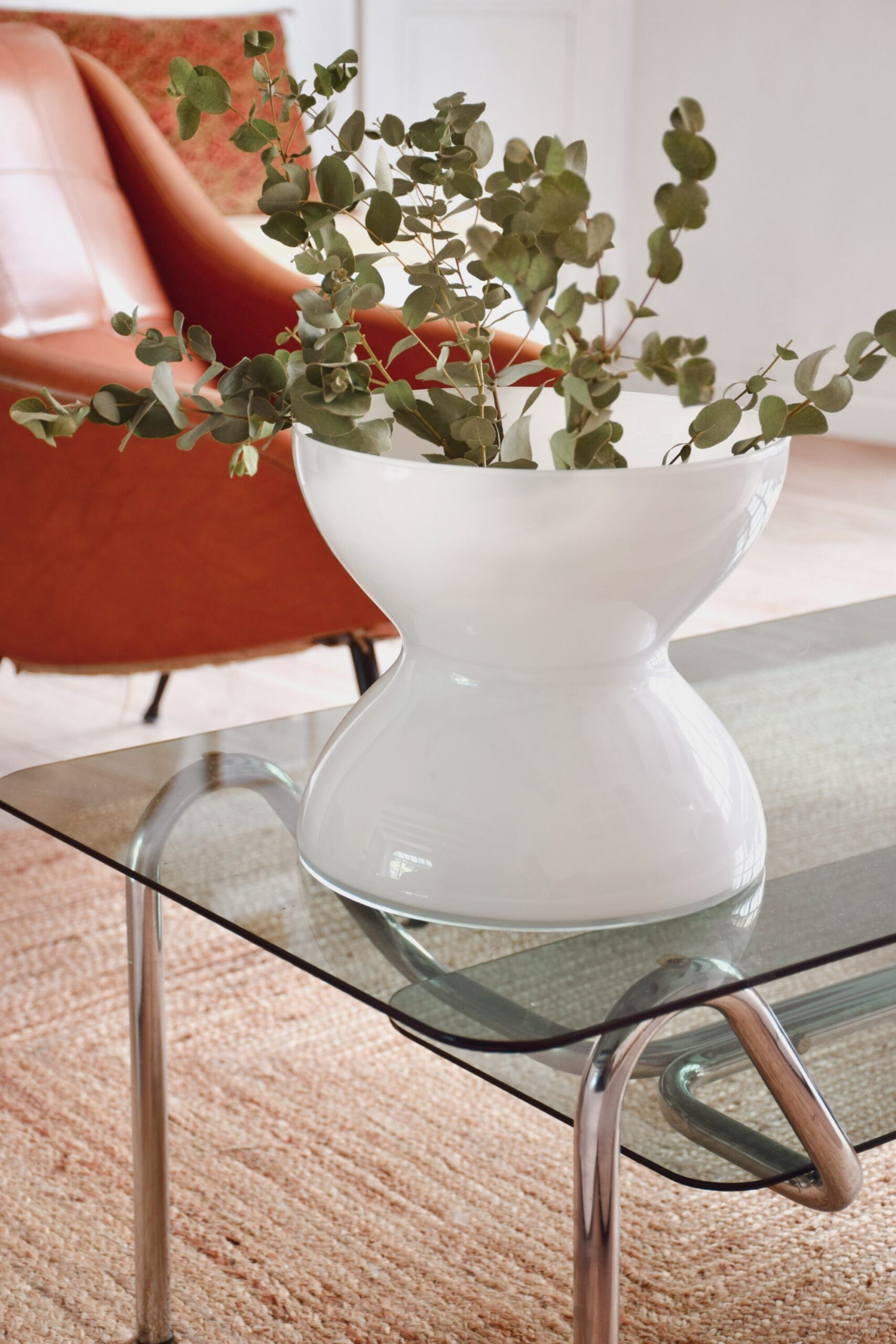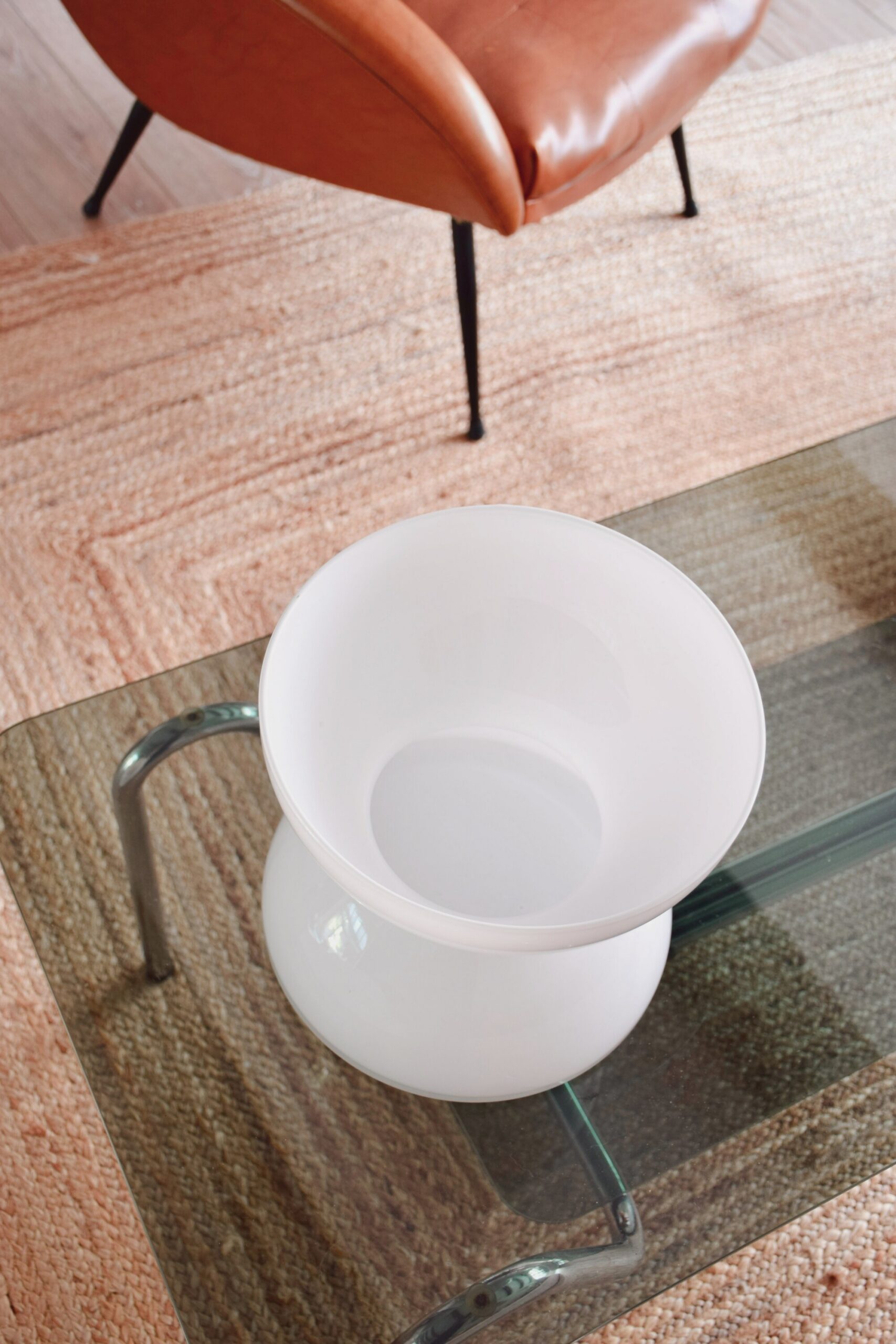 Fabriqué en verre opalin blanc et élégant, avec la forme sculpturale distinctive de diabolo qui rend ce design intemporel et moderne.