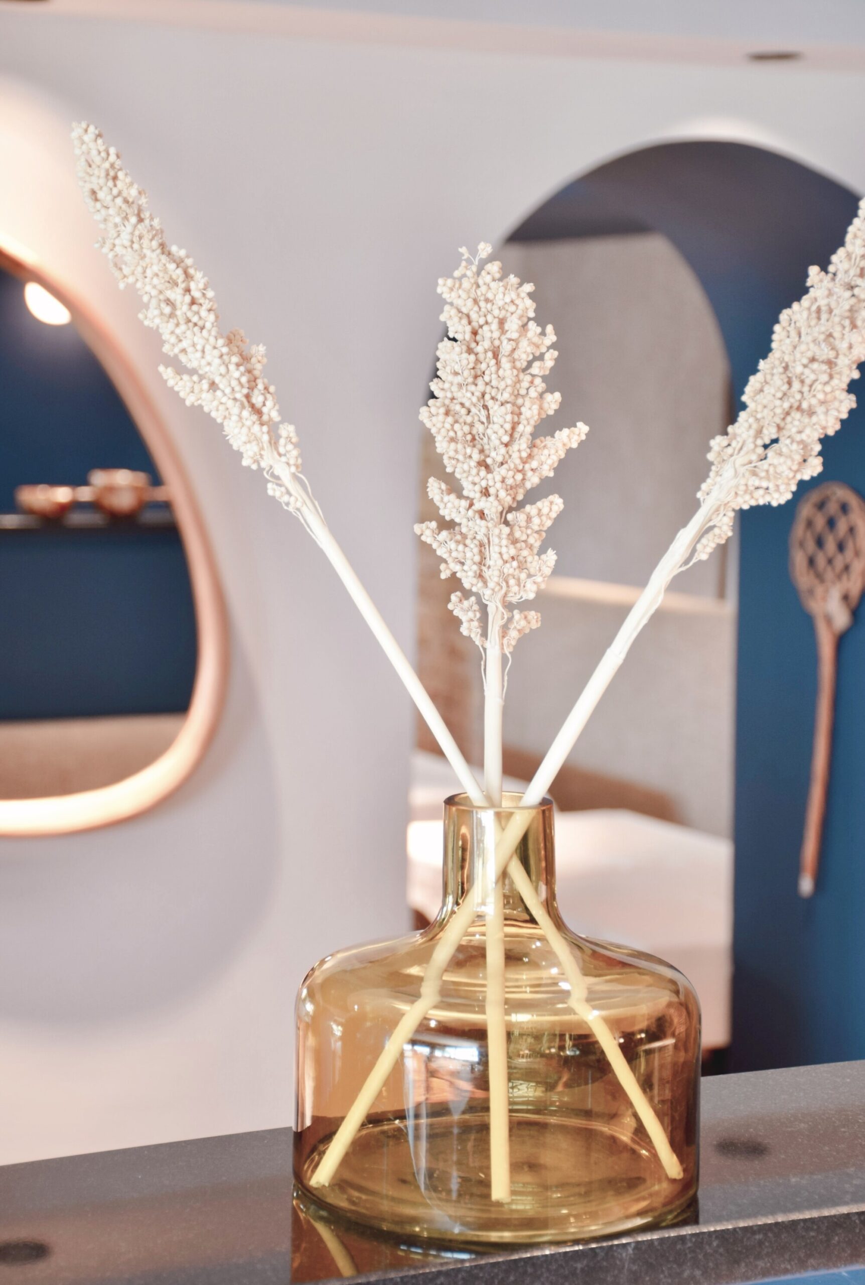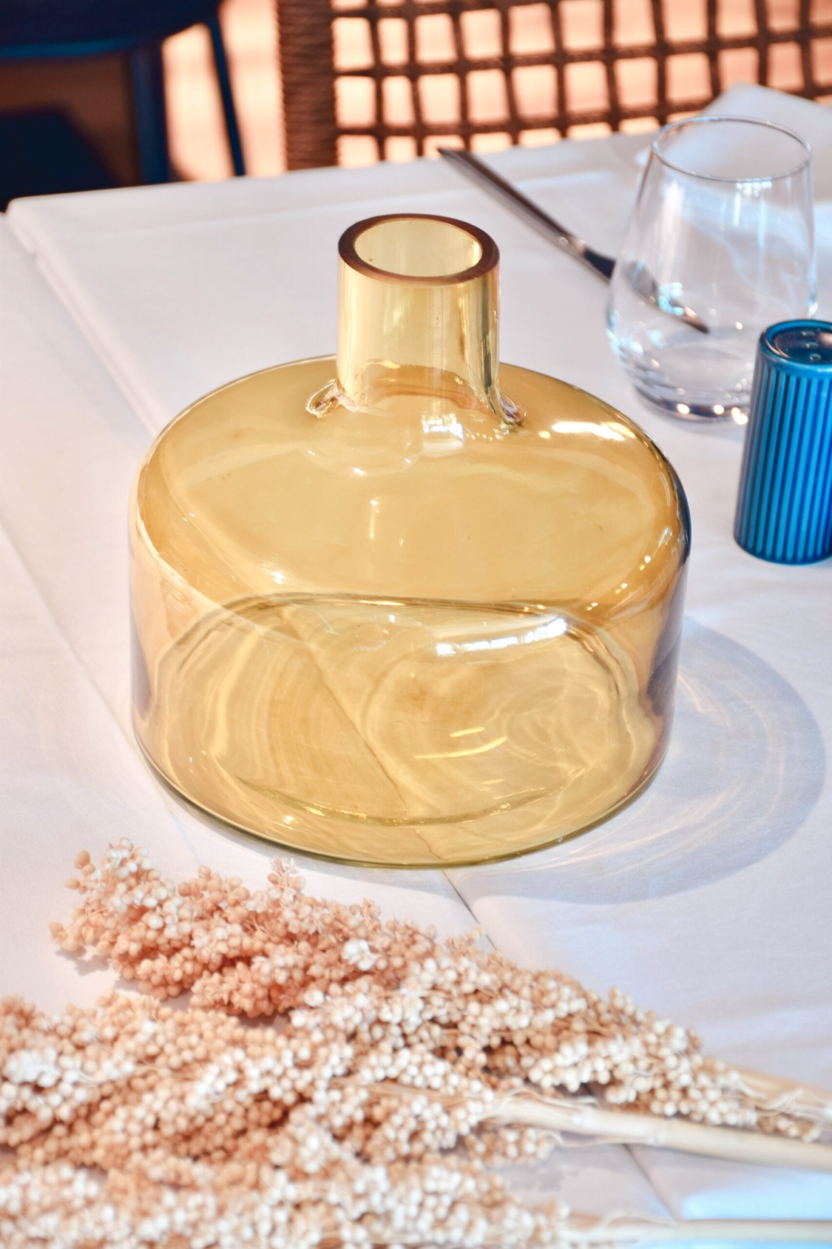 J’ai fondu pour ses courbes originales, sa couleur ambrée, le travail artisanal de son verre soufflé, son goulot Dame Jeanne et son socle qui met toute sa rondeur en valeur.